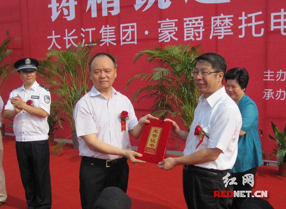 (湘潭市委副書記、市長史耀斌代表湘潭市人民政府向大長江集團頒發(fā)了捐贈榮譽證書。)