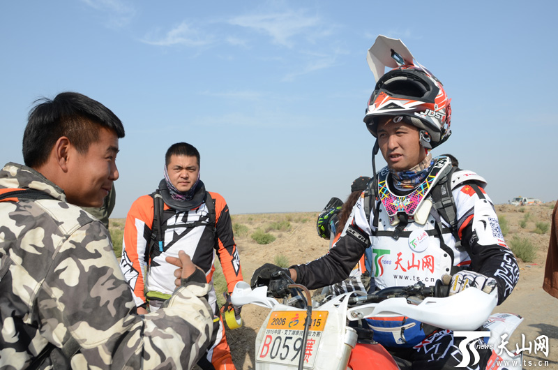 與上午吐魯番的天氣不同,下午在托克遜縣的第一賽段比賽終點(diǎn),當(dāng)選手們抵達(dá)時(shí)正在刮著9級(jí)左右的風(fēng),天山網(wǎng)環(huán)艾丁湖摩托車(chē)?yán)惒稍L團(tuán)隊(duì)的多名記者早已等候在這里,迎接我們車(chē)隊(duì)的三位勇士凱旋歸來(lái)。