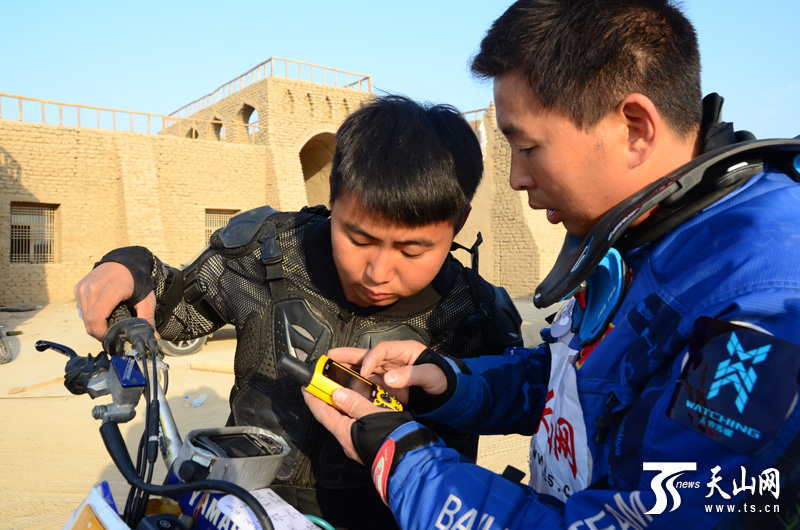 比賽開(kāi)始前,天山網(wǎng)全媒體車(chē)隊(duì)車(chē)手肖斌為車(chē)手任立功講解GPS的應(yīng)用技術(shù)。馬少賓攝