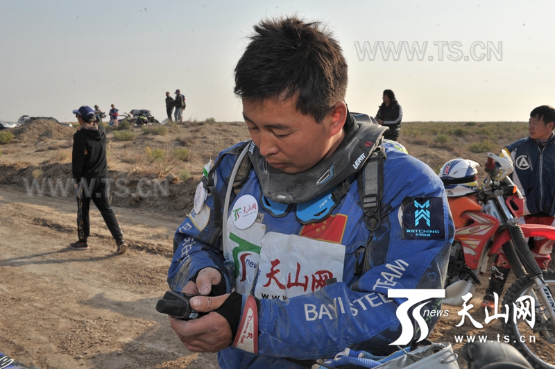天山網(wǎng)全媒體車隊(duì)車手肖斌在發(fā)車前調(diào)試GPS。