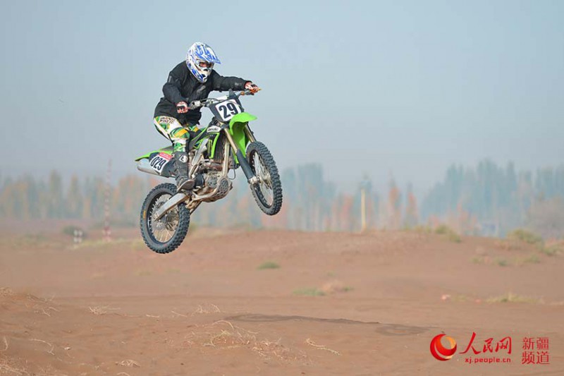 核心提示:2015環(huán)艾丁湖摩托車?yán)愂展賾?zhàn),圖為參賽選手飛越一處障礙。徐蒙 攝人民網(wǎng)鄯善10月24日電(徐蒙 王濤)23日,2015環(huán)艾丁湖摩托