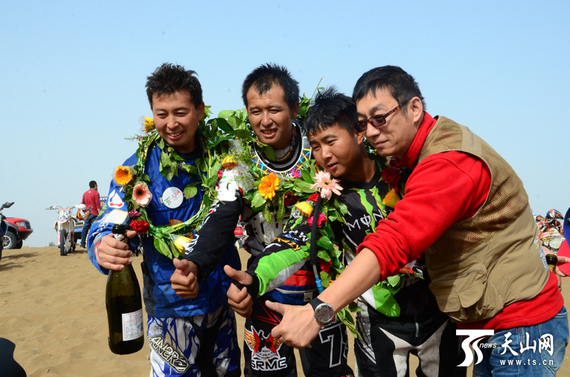 核心提示:天山網(wǎng)全媒體車隊成員完成比賽后慶祝。天山網(wǎng)訊(記者馬少賓攝影報道)10月23日,第十屆環(huán)艾丁湖摩托車?yán)惖谖遒惗紊衬揭袄?/div>