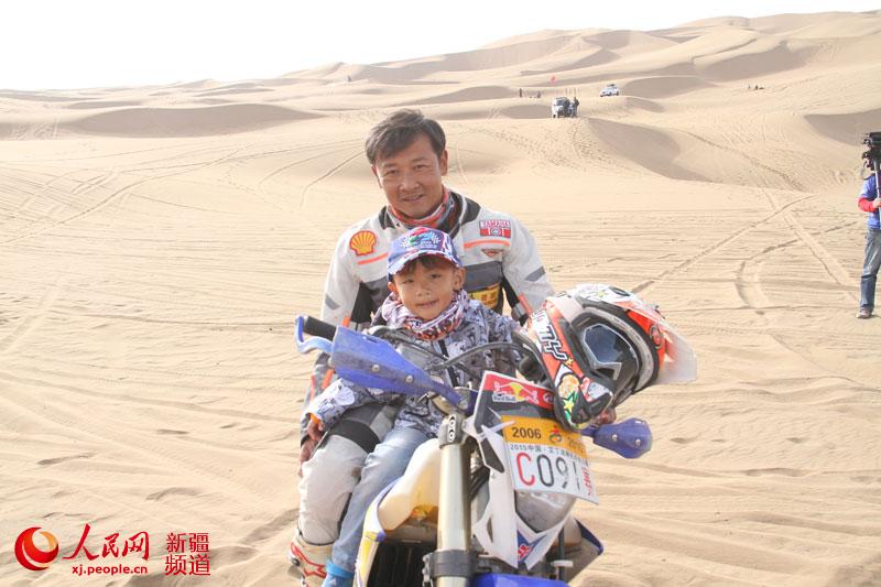 核心提示:云南車手毛杰和他的兒子在比賽現(xiàn)場。人民網(wǎng)吐魯番10月24日電(王濤 徐蒙)2015年中國吐魯番第十屆環(huán)艾丁湖摩托車越野拉力賽于10