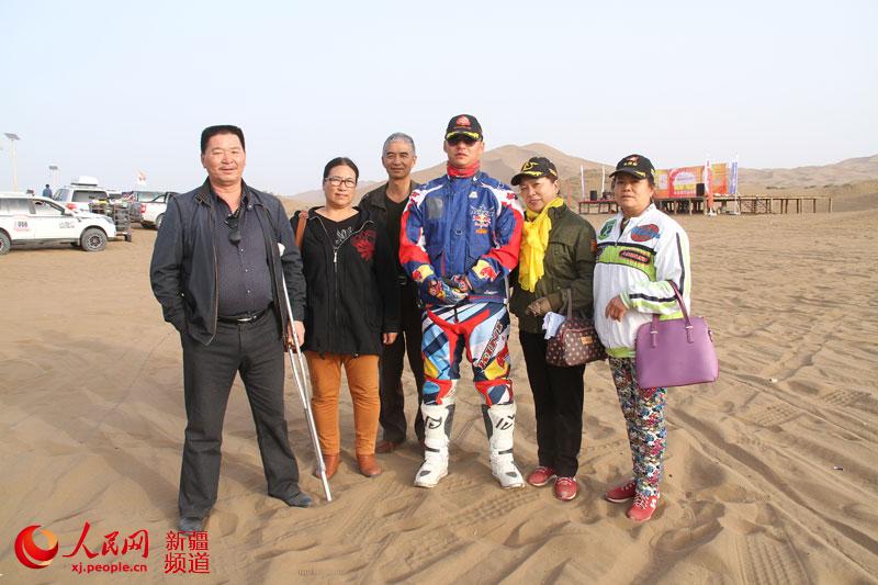 來自新疆五家渠的摩托車手楊樂參賽,他的父母和他的姨媽、干媽一行5人都來給他助威。他的父親前段時間出了車禍,還拄著拐杖。