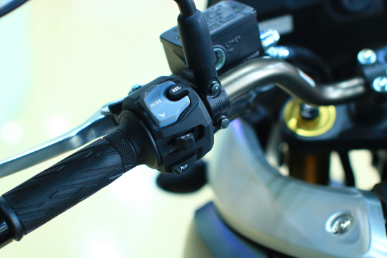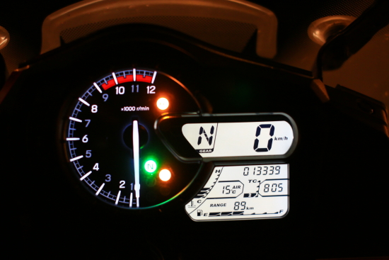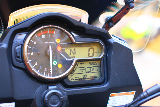 2014款V-Strom 1000的儀表板顯示信息量非常全面,超大指針式轉速表結合數顯時速表,可在不經意間洞察速度、轉速的細微變化。TC(牽引力工作狀態(tài))、空擋、電噴自檢、低溫警示(低于3℃)、遠光、檔位、機油、防凍液、TC模式選擇、大氣溫度、時鐘、防凍液溫度(量化顯示)、綜合油耗、瞬間油耗、總里程、短里程、電壓等顯示數據一應俱全。儀表板左側為儀表控制按鍵(Reset),儀表顯示六級儀表亮度控制擁有極佳的辨識度而且科技感十足。