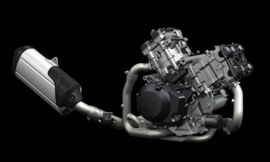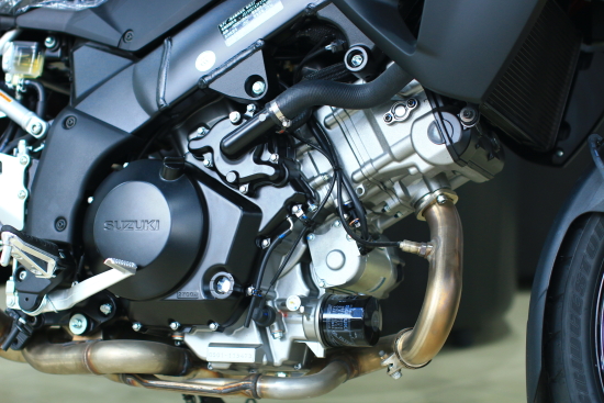 以2002款V-Strom 1000四氣門DOHC九十度V型雙缸發(fā)動機為原型,活塞直徑由98mm增大到100mm,排氣量也由996cc增大到1037cc。來自發(fā)動機的革新可遠遠不止一項簡單“擴容”,氣缸,氣缸蓋、活塞、活塞環(huán)、活塞銷、連桿、曲軸、曲軸箱、磁電機、飛輪、傳動、雙火花塞并配置離合器輔助等諸多革新改進,可以講2014款V-Strom 1000搭載的是一款近乎于全新設計的發(fā)動機。10孔噴油嘴替代4孔噴油嘴,ECU等供油系統(tǒng)進行全新匹配,最大功率73kW/8000轉,最大扭矩103N.m/4000轉,2014款V-Strom 1000增大動力輸出的同時降低了相對轉速,中低轉速扭力輸出更加強勁。