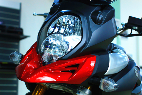 2014款V-Strom 1000延續(xù)鈴木GSX1300R-HAYABUSA“隼”堆疊式大燈設計,近光、遠光、駐車燈由上至下依次縱列。