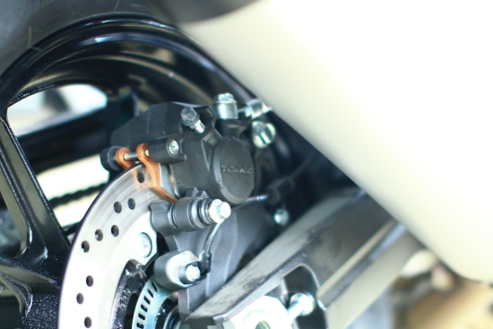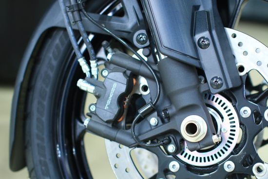2014款V-Strom 1000前制動采用雙浮動盤東機工(Tokico)對向四活塞輻射式雙卡鉗,后制動配置東機工單活塞卡鉗,博世(Bosch)ABS防抱死系統(tǒng)為標配。