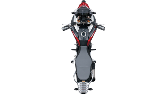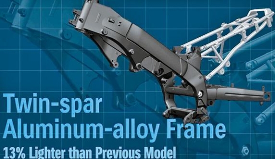 以2002款雙翼梁鋁合金跑車車架為藍本重新設計的新車架,剛性更強、重量更輕并融入了全新幾何結構設計。相比老款,新后搖臂加長20mm, 前軸至中軸距縮短6mm,這意味著轉向更靈活度、高速更穩(wěn)定性。前、后Kayaba(KYB)全段可調減震器,43mm倒置式長行程前減震、連桿式后減震。