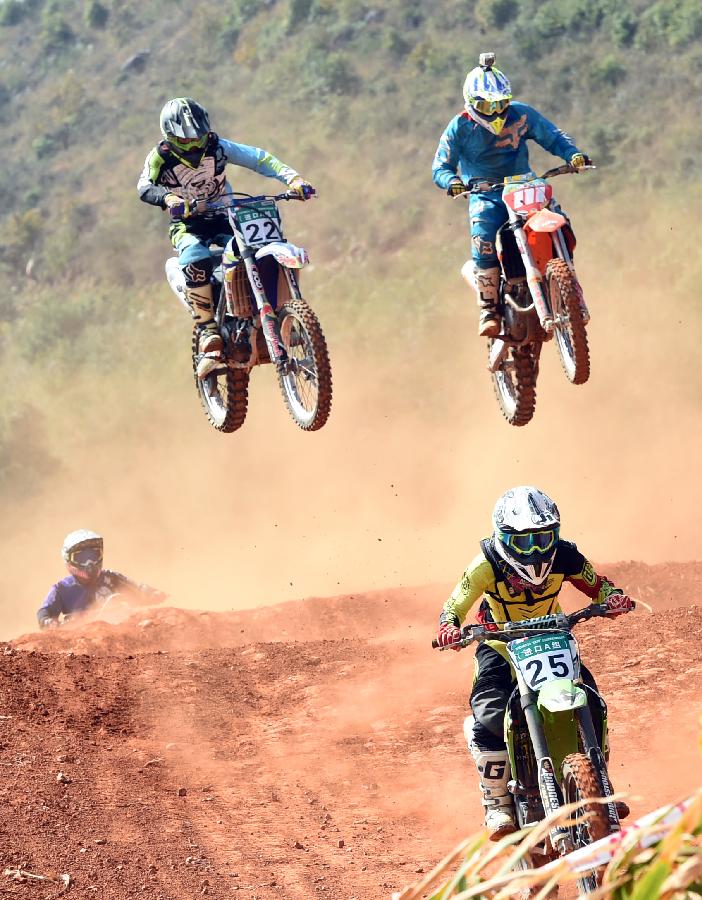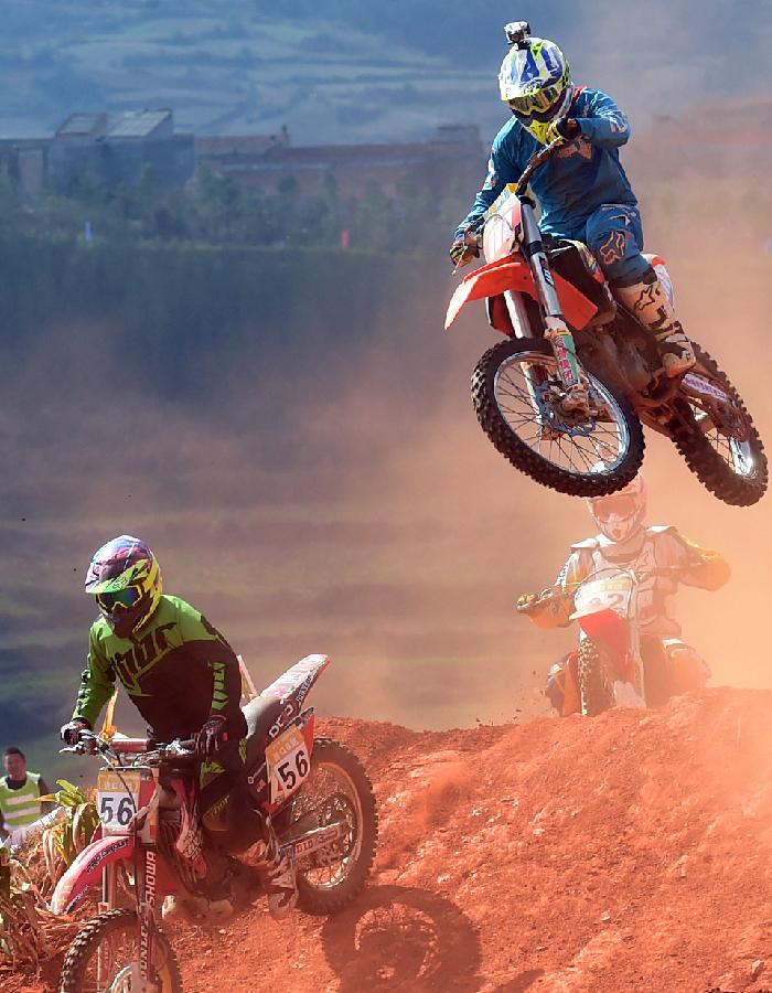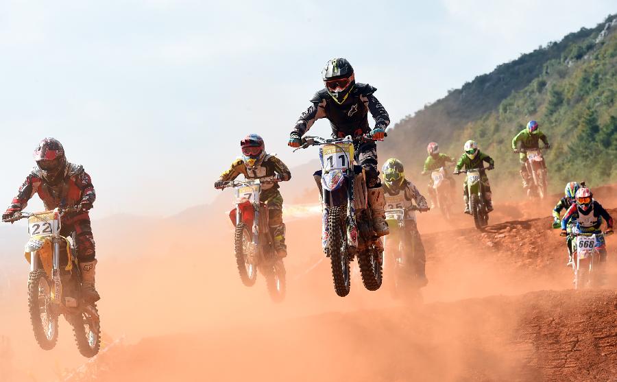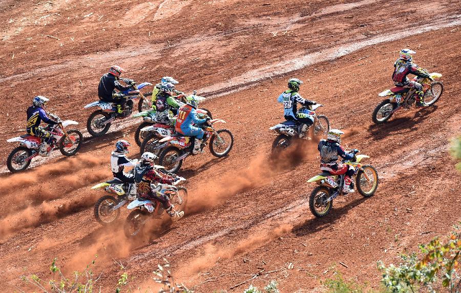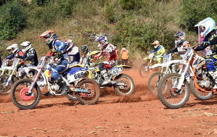 11月28日,參賽車手在進(jìn)口車B組比賽中。當(dāng)日,為期兩天的2015ESA全國(guó)越野摩托車明星邀請(qǐng)賽第二站比賽在云南曲靖開賽,共有來自全國(guó)各地38支車隊(duì)的200多名摩托車手參賽。