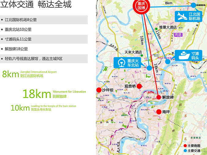 重慶國際博覽中心距重慶江北國際機(jī)場7公里、火車站13公里、距市中心約24公里;輕軌六號線直達(dá)展館,軌道交通連通重慶主城9區(qū),地理環(huán)境優(yōu)越,交通十分便利。