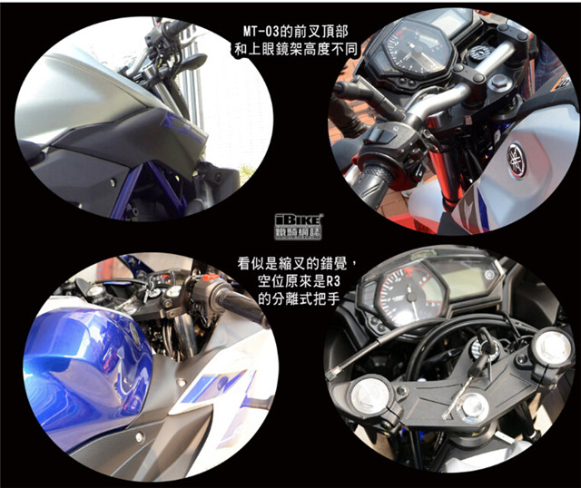 細(xì)看MT-03的41mm前叉,上眼鏡架從fork頂露出一截,看似縮了叉low低了頭擔(dān)。原來這只是錯(cuò)覺。MT-03和YZF-03的上眼鏡架和前叉高度完全一樣,只是R3的分離式把手是直接套在頭叉頂部,所以眼鏡架必須預(yù)留轉(zhuǎn)向把手的厚度。而MT-03因采用街車把手,所以頭叉頂部沒有套上轉(zhuǎn)向把手而露出一截,做成縮叉low低頭擔(dān)的錯(cuò)覺。