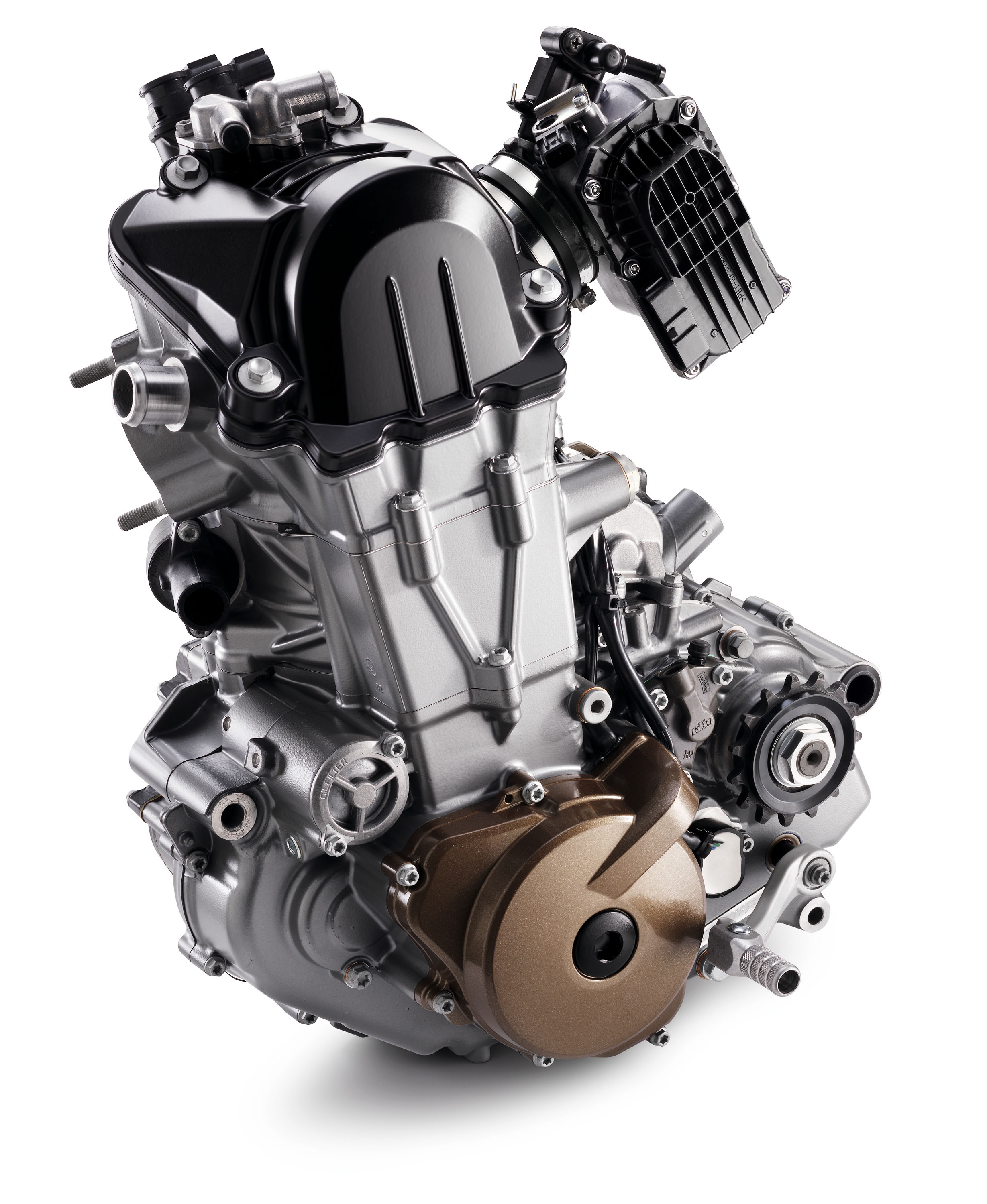 新的 701 采用一副水冷四沖程單汽缸、OHC 四汽閥的發(fā)動機(jī),缸徑、行程分別為 102 mm、84.5 mm,排汽量 690 cc,最大動力輸出 49 kw/67 匹。該數(shù)據(jù)與 KTM 現(xiàn)行銷售中的 2015 款 690 SMC R 公路越野之發(fā)動機(jī)相同。發(fā)動機(jī)的供油系統(tǒng)為電子燃油噴注、采用了口徑為 46 mm 的京濱節(jié)汽閥。六檔的齒輪箱,ATPC 滑動式的油壓離合器。新車的發(fā)動機(jī)輸出特性有三種模式可選:標(biāo)準(zhǔn)(Standard)、軟(Soft)、先進(jìn)(Advanced),車手可根據(jù)不同的使用環(huán)境、通過座位下的開關(guān)作出簡單的設(shè)置。