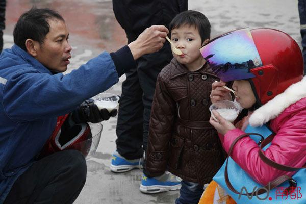 2015年2月12日,肇慶封開長(zhǎng)崗收費(fèi)站休息點(diǎn),陳先生正給孩子喂熱粥。 南都資料圖