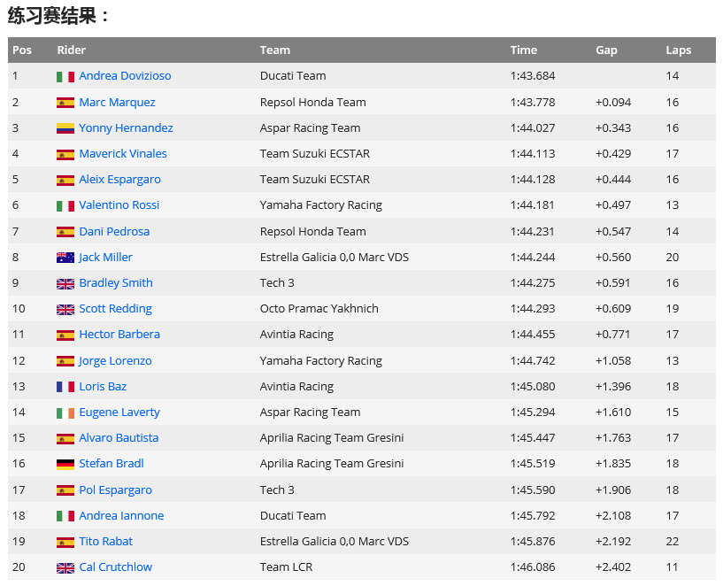 Honda第二快的摩托車手佩德羅薩也搶在米勒前面,位居第七,與馬奎茲相差不到0.5秒。史密斯, 雷丁和巴柏拉(Barbera)在后。在位冠軍洛倫佐似乎賽道狀況有所顧慮,只排在12名。Yamaha Tech 3的P-埃斯帕加羅是這段練習(xí)中唯一出了小意外的車手,練習(xí)后半段他在第7彎摔了出去。