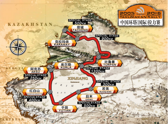 按照既定的線路,2016環(huán)塔拉力賽的賽手們將從塔城出發(fā),沿土爾扈特部族東歸線路,一路向南,翻天山,經(jīng)東疆吐魯番過羅布泊,掠過塔克拉瑪干東南邊緣,沿古絲綢之路南路,迂回向西,然后掉頭向北,抵達終點南疆重鎮(zhèn)阿克蘇的溫宿縣,完成該賽事迄今為止最為漫長和最具史詩情境的征程。
