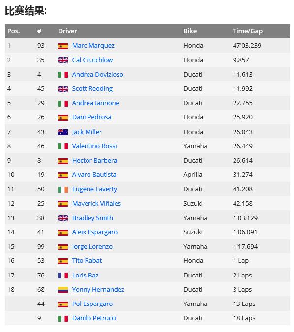 擁有速度優(yōu)勢的LCR本田車手克拉齊羅最終以第二名完賽、多維齊奧索也在最后一圈超越雷丁,搶下頒獎臺上的最后一個位置。