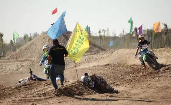 比賽異常激烈,好幾名摩托車手摔倒。