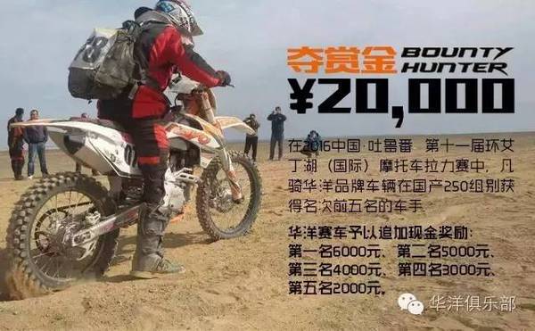 浙江華洋賽車股份有限公司繼“東川泥石流摩托車越野賽”和“安寧八街大黑山礦山摩托車越野賽”,對“2016中國·吐魯番 第十一屆環(huán)艾丁湖(國際)摩托車?yán)?rdquo;賽事期間予以支持,凡騎華洋品牌車輛在國產(chǎn)250組別獲得名次前五名的車手,我們將給予豐厚的現(xiàn)金作為獎(jiǎng)勵(lì)!