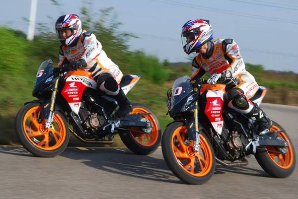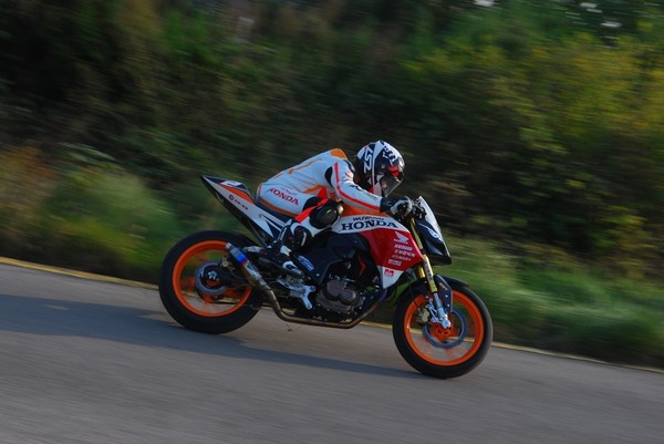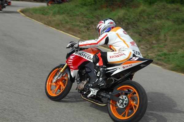 在充分熟悉賽道之后,實車練習開始了——教練駕車在前、學員緊隨其后,針對賽道改裝的嶄新的暴鋒眼CB190R馱著身著嶄新護具的車手們,在賽場上一圈圈奔跑并在教練的引導下越跑越快……