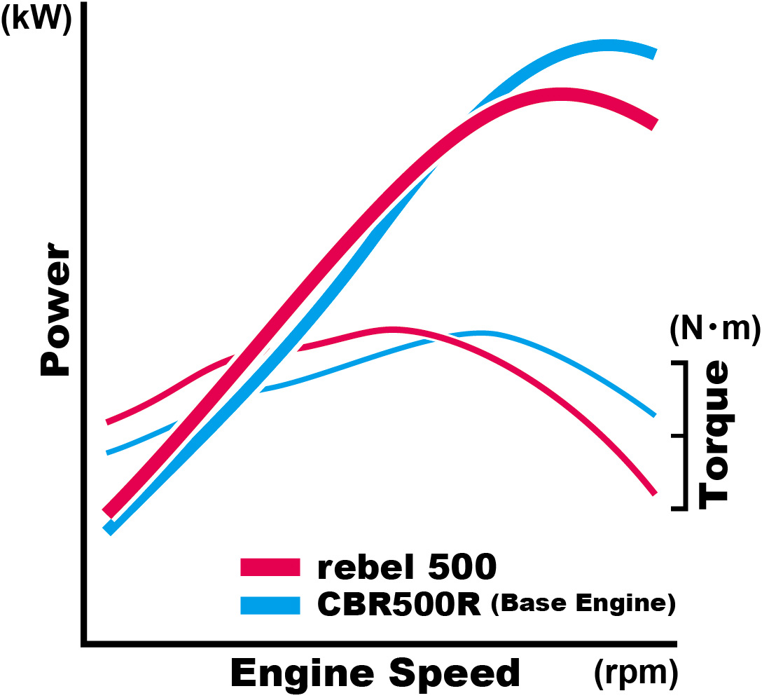 下圖:2017' Rebel 500 與 CBR 500R 的動(dòng)力輸出曲線對(duì)比