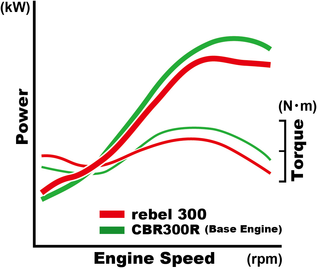 下圖:2017' Rebel 300 與 CBR 300R 的動(dòng)力輸出曲線對(duì)比。