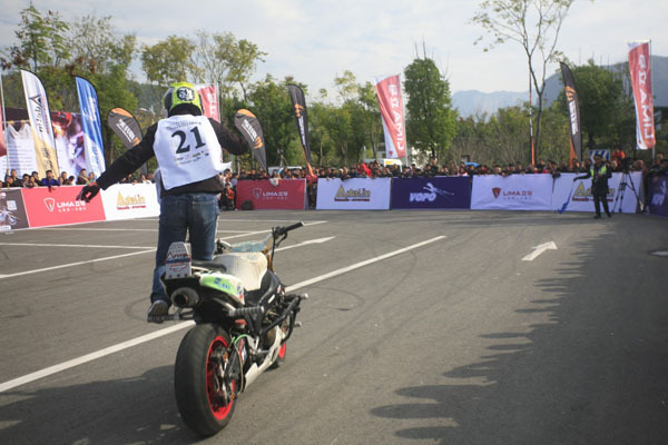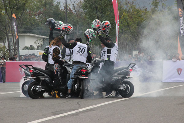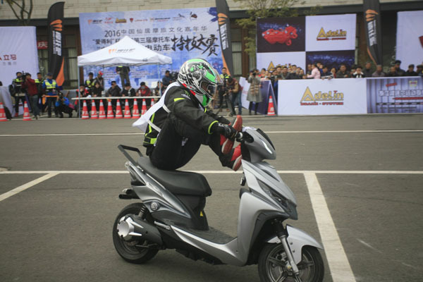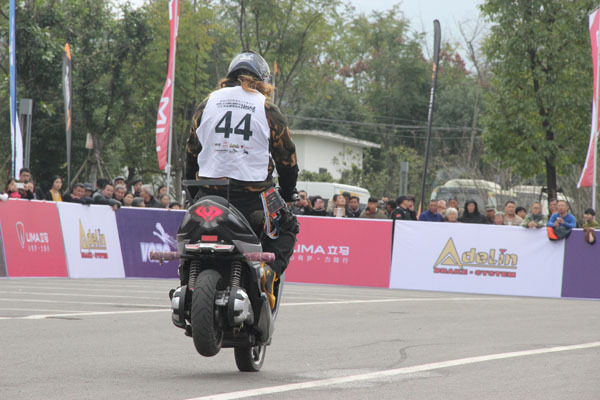 本屆大賽分為400cc及以上車型組、400cc以下組、踏板車組、電動(dòng)摩托車組等五個(gè)專業(yè)級(jí)別。賽場(chǎng)上,車手們駕駛賽車,抬頭、翹尾、燒胎、飄逸、徒手平衡、花式下車多種特技,不時(shí)引起陣陣歡呼與驚嘆。歷時(shí)兩天,電動(dòng)車組的15位專業(yè)俱樂(lè)部車手以及民間大神競(jìng)相角逐,預(yù)賽、表演賽、淘汰賽、決賽環(huán)環(huán)相扣,緊張有序。俱樂(lè)部車手03號(hào)楊波在淘汰賽中涉險(xiǎn)過(guò)關(guān),讓隊(duì)友捏了一把汗,然而決賽發(fā)揮穩(wěn)定,特技動(dòng)作突出,成功奪冠。44號(hào)車手王飛摘銀,33號(hào)車手張峰獲季軍。