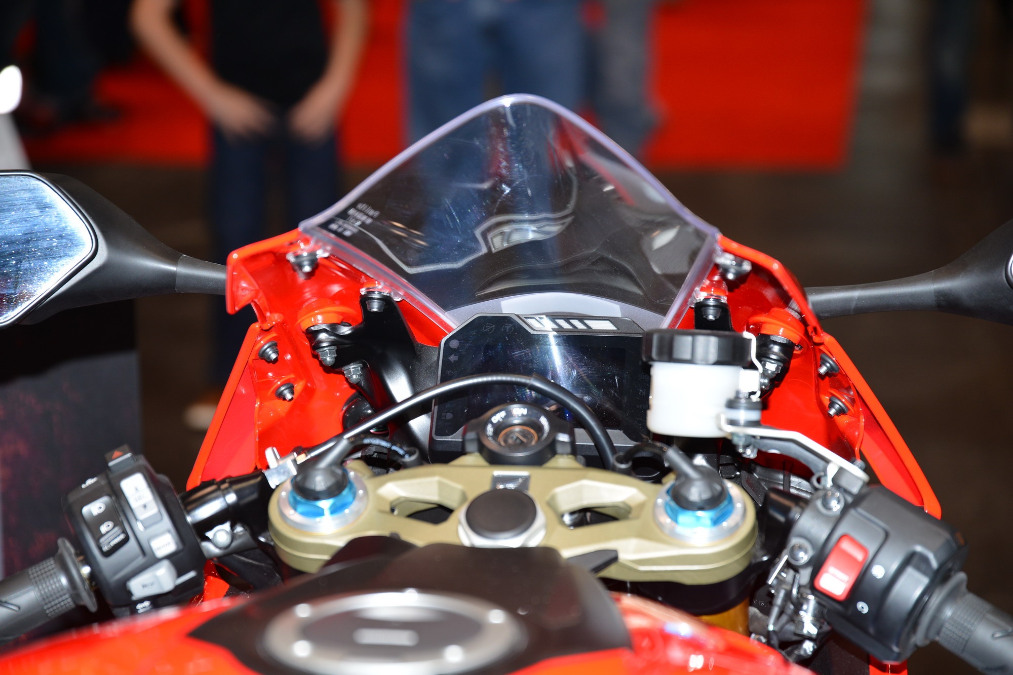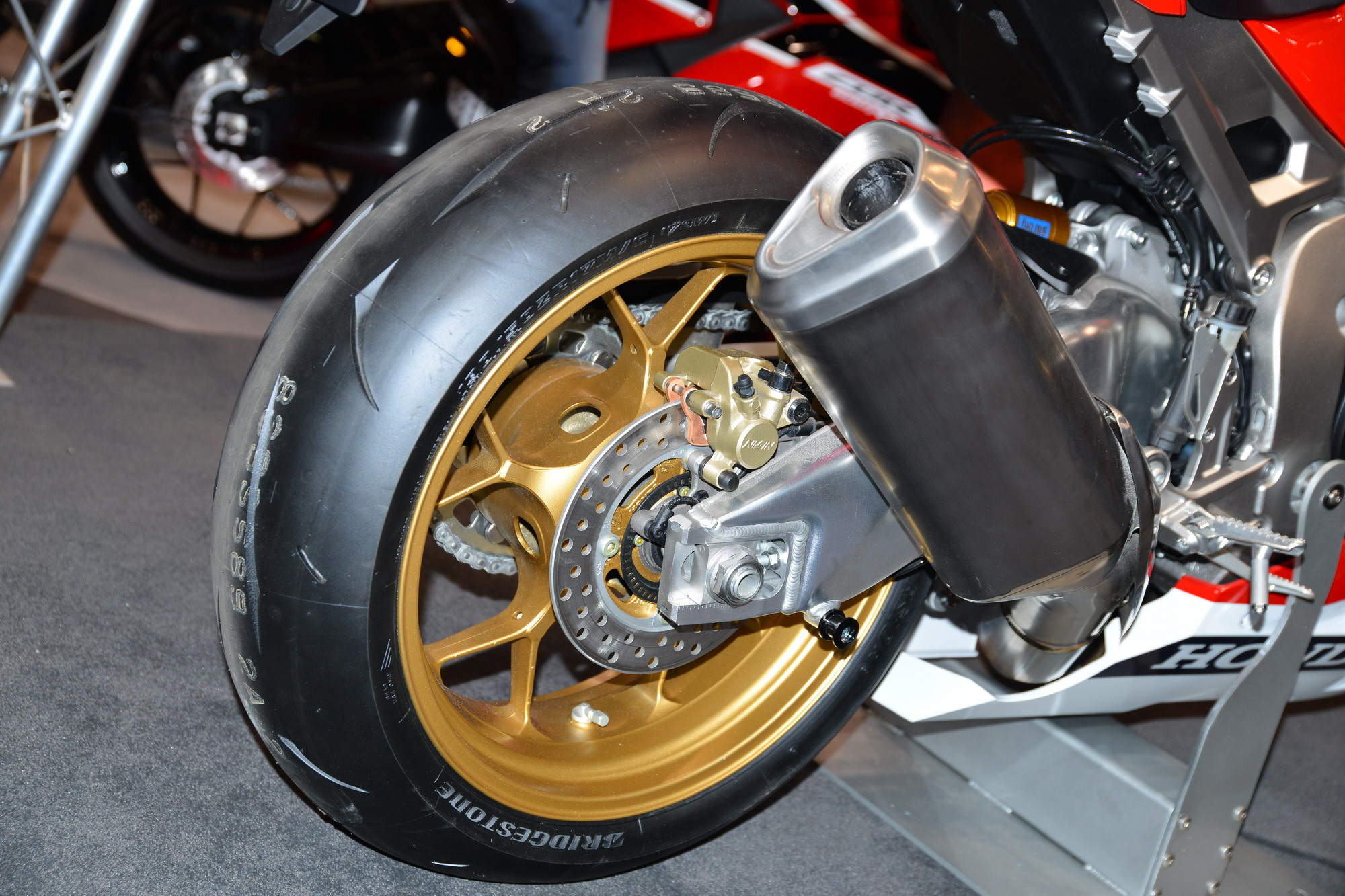 Honda 的展臺(tái)上,展示了他們最新的超級(jí)跑車 CBR1000RR SP/SP2。粗壯的鋁合金車架、后搖臂,幾乎滿是按鍵的兩邊車把、加上車頭周圍到處都是的感應(yīng)線,真可謂科技感十足。