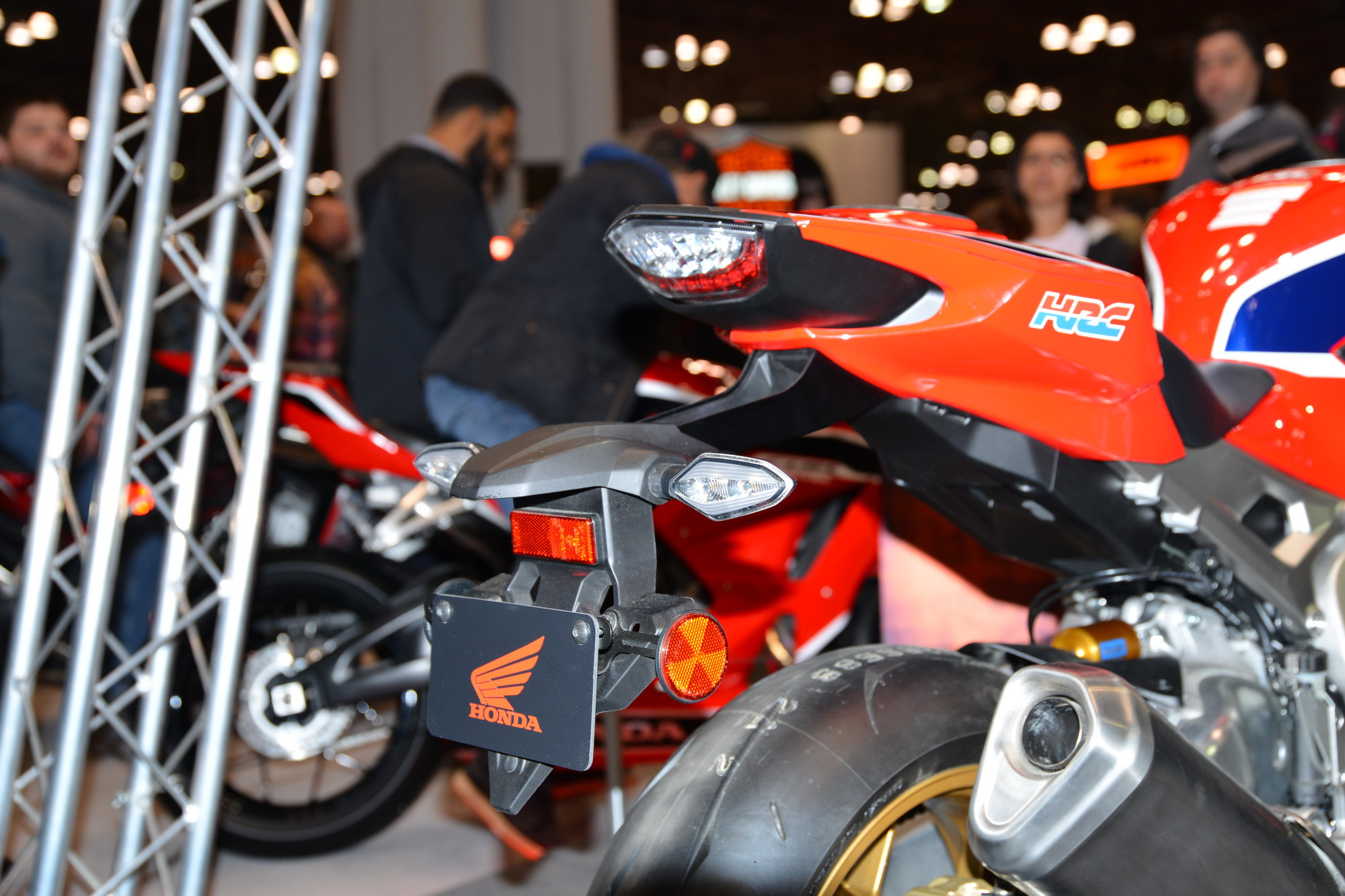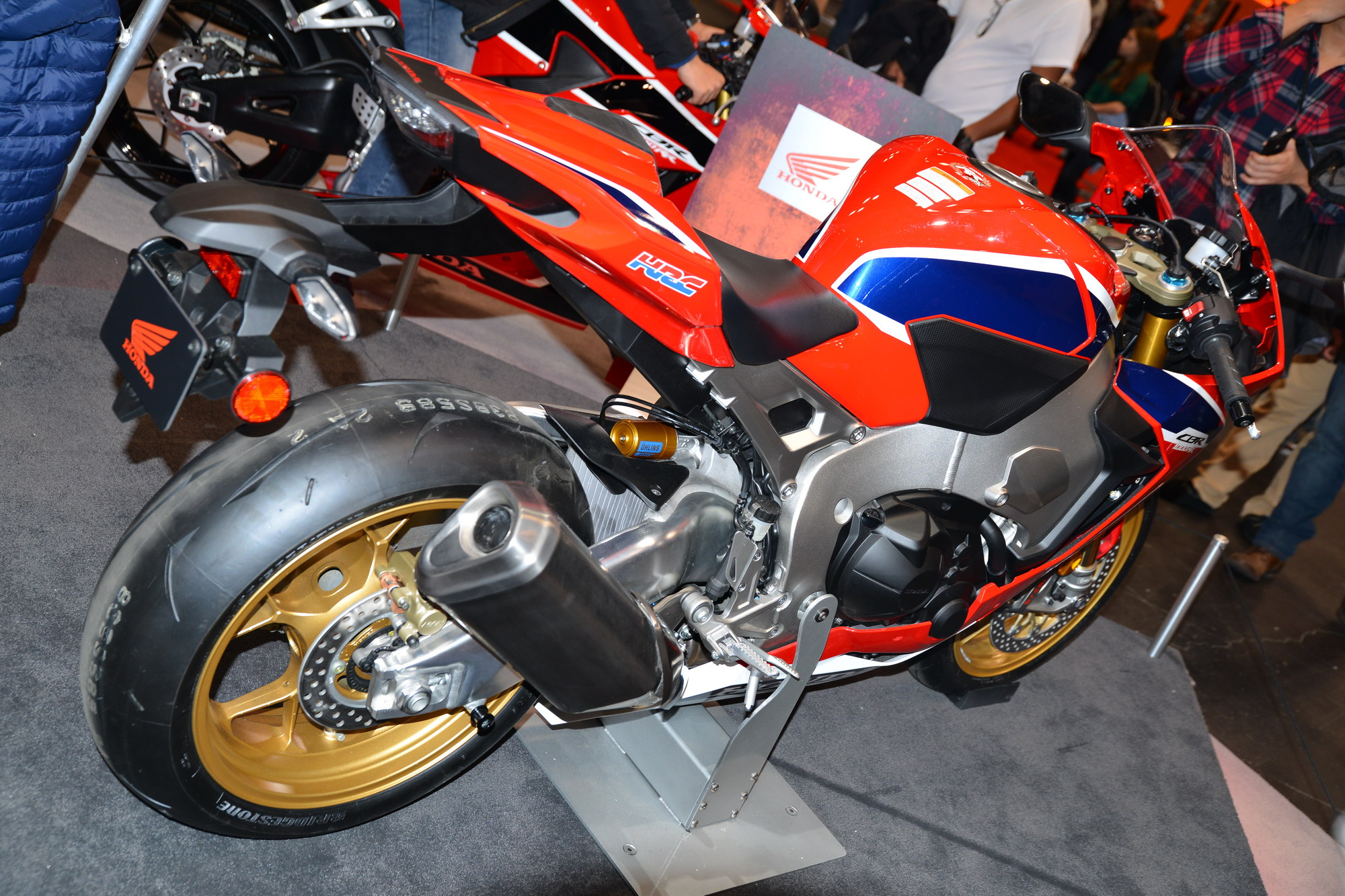 核心提示:Honda 的展臺(tái)上,展示了他們最新的超級(jí)跑車 CBR1000RR SP/SP2。粗壯的鋁合金車架、后搖臂,幾乎滿是按鍵的兩邊車把、加上車頭周