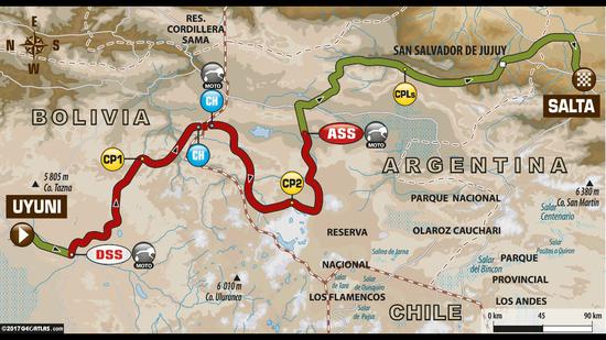 本賽段從玻利維亞烏尤尼出發(fā),終點(diǎn)設(shè)在阿根廷的薩爾塔,賽段全長(zhǎng)892公里,原本特殊賽段492公里,但是比賽再次受到大雨襲擊,導(dǎo)致河床水位升高,所以組委會(huì)再次更改了SS8賽段比賽線路,將特殊賽段縮短為417公里。