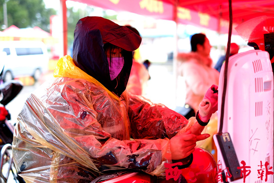 受冷空氣影響,當(dāng)天,梧州市出現(xiàn)了持續(xù)陰雨天氣,氣溫低至10℃左右。記者身穿羽絨服在戶外采訪時(shí),仍然能夠感受到陣陣寒意,但寒風(fēng)冷雨未能阻擋“摩托大軍”回家的腳步。早上10時(shí)過(guò)后,雨勢(shì)加大,一批批“摩托大軍”陸續(xù)進(jìn)入東出口春運(yùn)服務(wù)站休息。
