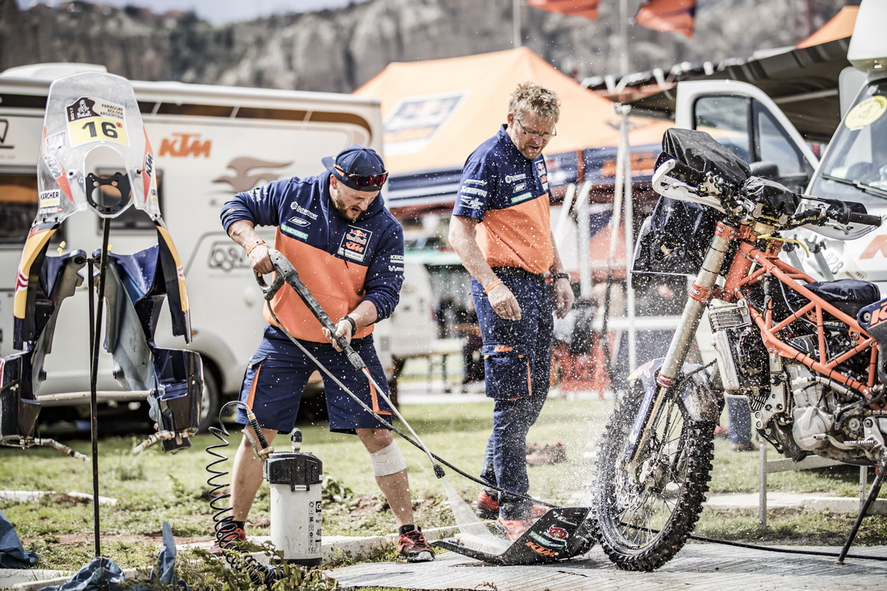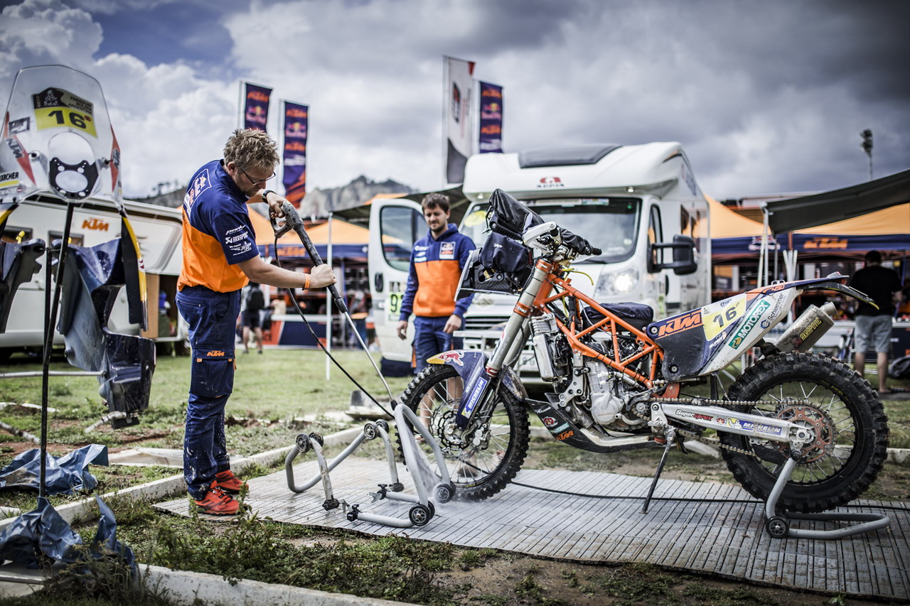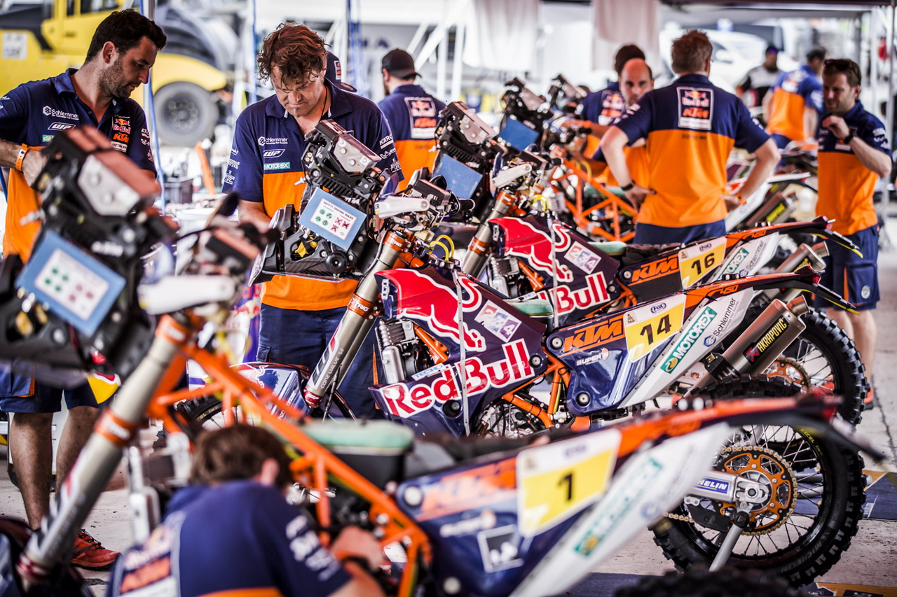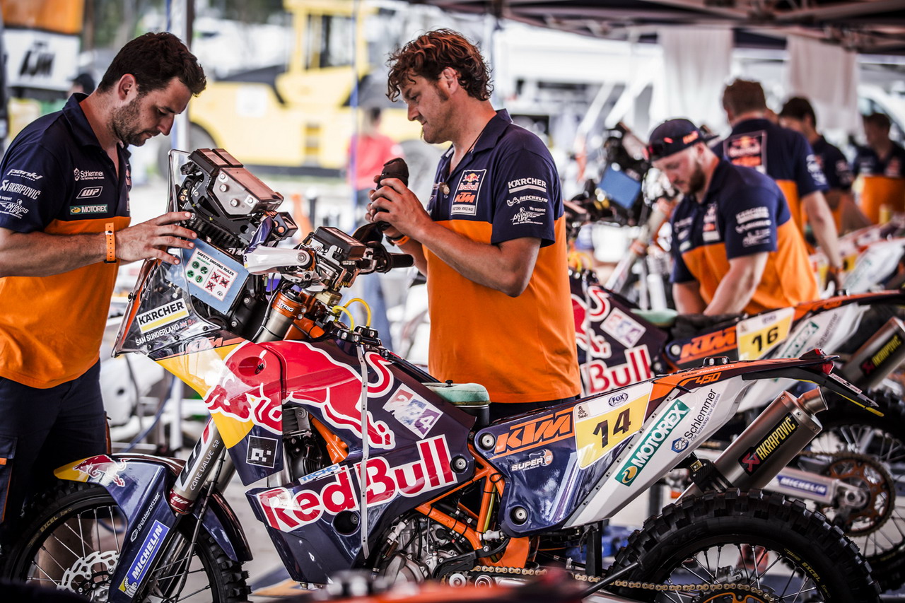 而在摩托車組最后完賽的 97 名車手中、有多達(dá) 57 位采用的是 KTM 的賽車,幾乎達(dá)到了 60% 的比例,后援工作的關(guān)聯(lián)程度是其他賽車所不可比擬的,針對(duì) KTM 賽車的后勤團(tuán)隊(duì)可謂各式各樣。盡管對(duì)于爭(zhēng)奪冠軍這種工廠車隊(duì)才需要去做的事情,參賽車輛 的多寡并不起決定性的作用,但這也就可以從另一個(gè)角度去理解 KTM 從賽車性能到整體后勤支援的經(jīng)驗(yàn)積累與綜合應(yīng)對(duì)能力,所達(dá)到的高度。