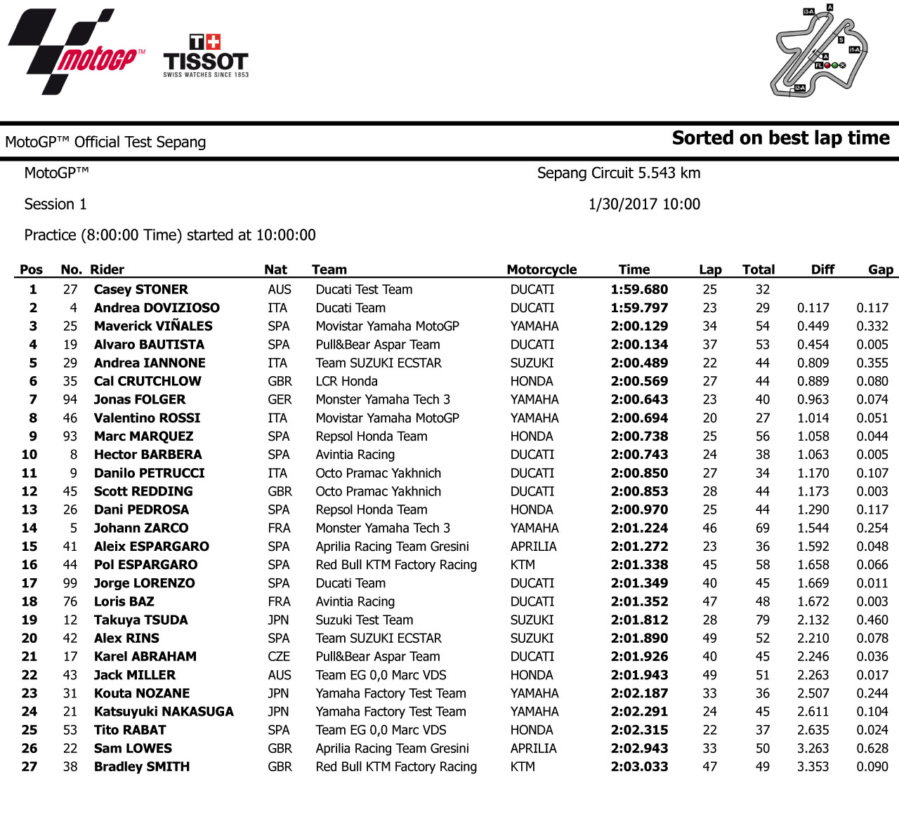 2017' 年度 MotoGP 第一次 IRTA 季前測(cè)試,昨天和今天、連續(xù)兩天在馬來(lái)西亞的雪邦賽車(chē)場(chǎng)舉行。全部的廠隊(duì)和多支衛(wèi)星車(chē)隊(duì)都參加了這次的測(cè)試,只是有的車(chē)手狀態(tài)較佳、而有的似乎還在冬季假期進(jìn)行中,表現(xiàn)差異大。