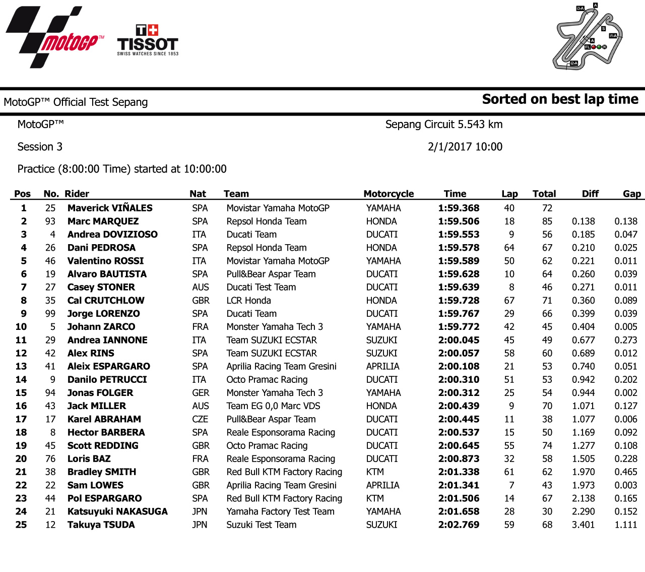 第三天的測(cè)試,最快圈速比之前的兩天有所提高,盡管還沒(méi)有車手能夠突破彼杜莎 1 分 59.053 秒的最快圈速記錄,但已經(jīng)有十位車手突破了 1 分 59 秒的大關(guān)。 Yamaha 車隊(duì)的小將維那尼斯跑出了 1 分 59.368 秒成為這次測(cè)試的最快圈速創(chuàng)造者,Honda 車隊(duì)的應(yīng)屆世界冠軍馬昆斯跑出了  1 分 59.506 秒排第二,杜卡迪車隊(duì)的杜維斯奧索跑出了  1 分 59.553 秒排在了第三。
