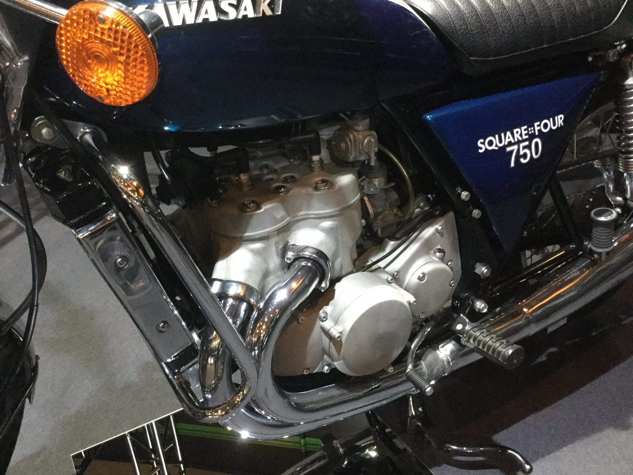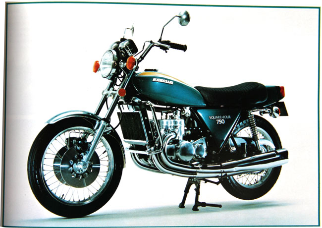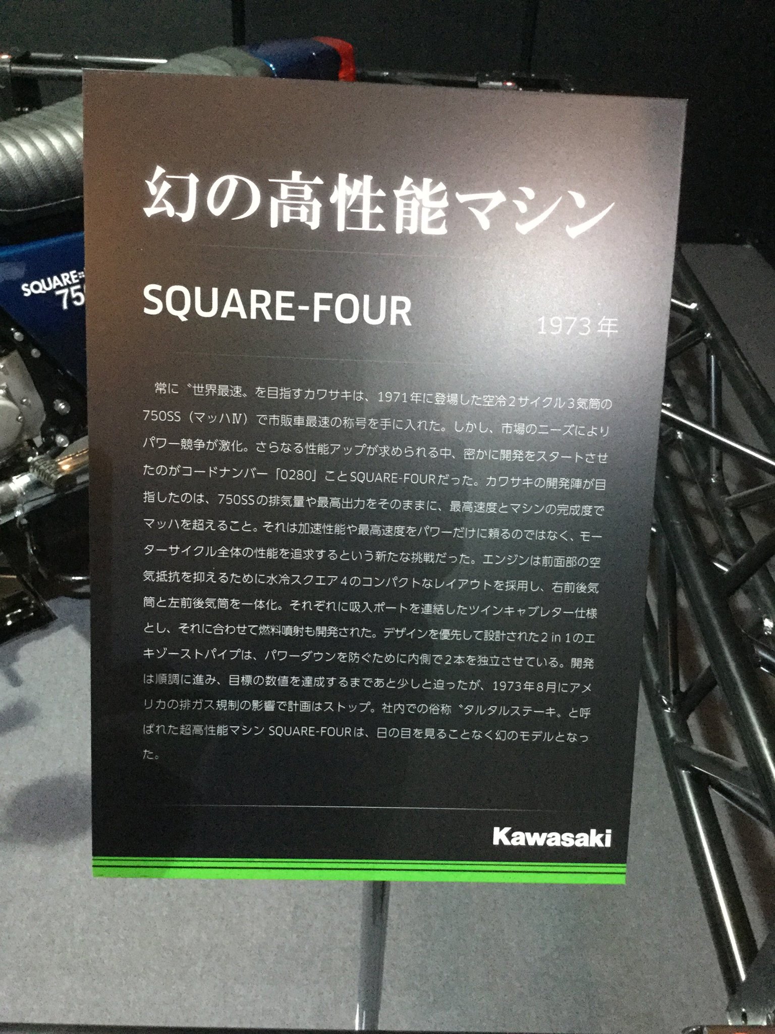 針對激烈的競爭,Kawasaki 展開了秘密的 0280 項目,這個項目的目標(biāo)就是下面圖片的這部 Square-Four 750。Square-Four 750 搭載一副水冷兩沖程正四方四汽缸(左右各一組汽缸、每組兩個)的發(fā)動機,排汽量是 750 cc 的級別,廠方同時也為其專門開發(fā)了燃油噴注系統(tǒng),以實現(xiàn)在當(dāng)時技術(shù)條件下的 “ 超高性能 ”。到了 1972 年的時候,這部具有劃時代技術(shù)的 Square-Four 750 已經(jīng)完成了樣車/原型車的組裝、并曾在本土的一些展覽會上露面,但受到新的排放標(biāo)準(zhǔn)法規(guī)的影響,廠方在 1973 年的八月份宣布放棄量產(chǎn)、項目結(jié)束,Square-Four 750 最終只能成為一部供展示用的陳列品。