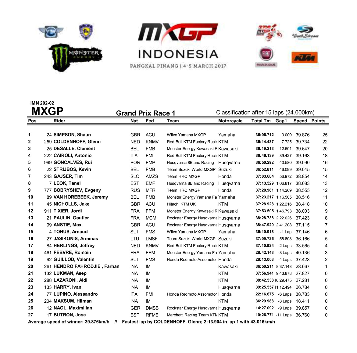 下圖:MXGP 級(jí)別第一節(jié)賽事成績(jī)