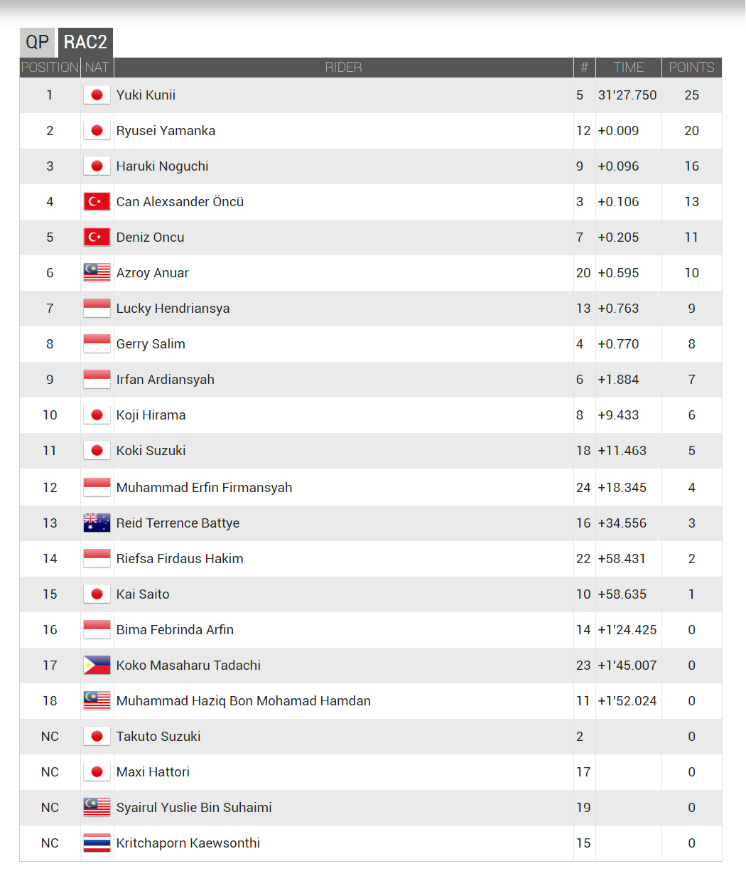 僅得一節(jié)的比賽,賽況與過往同樣的激烈。駕駛 5 號賽車、現(xiàn)年 14 歲的日本車手國井勇輝(Yuki Kunii)最后成功突圍、奪得卡塔爾站的冠軍;駕駛 12 號賽車、現(xiàn)年 15 歲的另一名日本車手山中琉圣(Ryusei Yamanka)以 0.009 秒之差獲得了第二;曾經(jīng)代表過日本前 MotoGP 車手中野真矢所帶領(lǐng)的 56 Racing 車隊參賽的、現(xiàn)年 15 歲的日本車手埜口遙希(Haruki Noguchi,9 號車)落后頭車 0.096 秒拿到了第三。前八位沖線的車手,時間相差不到 1 秒。在第一站(泰國武里南)拿到雙冠軍的土耳其車手 Deniz Oncu(7 號車)落后頭車 0.205 秒,拿到了本站的第五名。