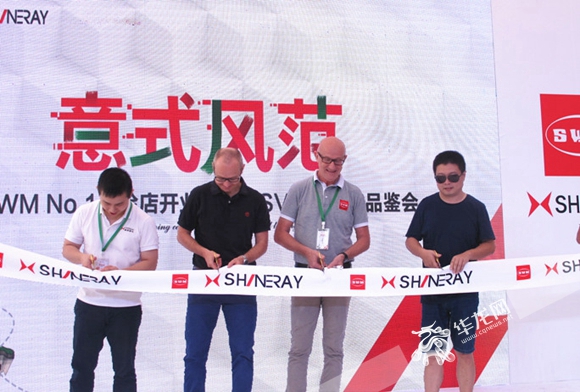來(lái)自意大利的SWM營(yíng)銷總監(jiān)Sandro先生和中方店長(zhǎng)一起為直營(yíng)體驗(yàn)店開業(yè)剪彩