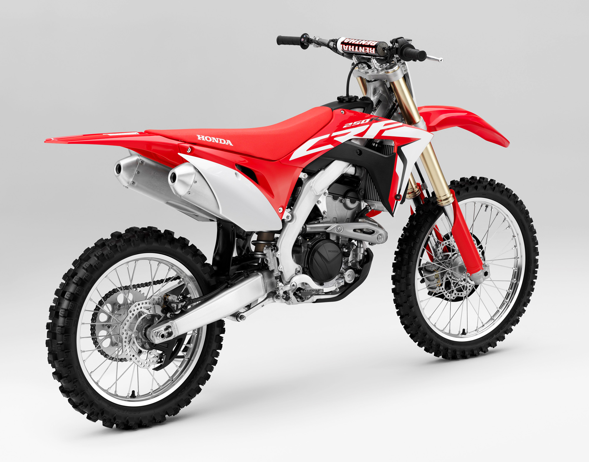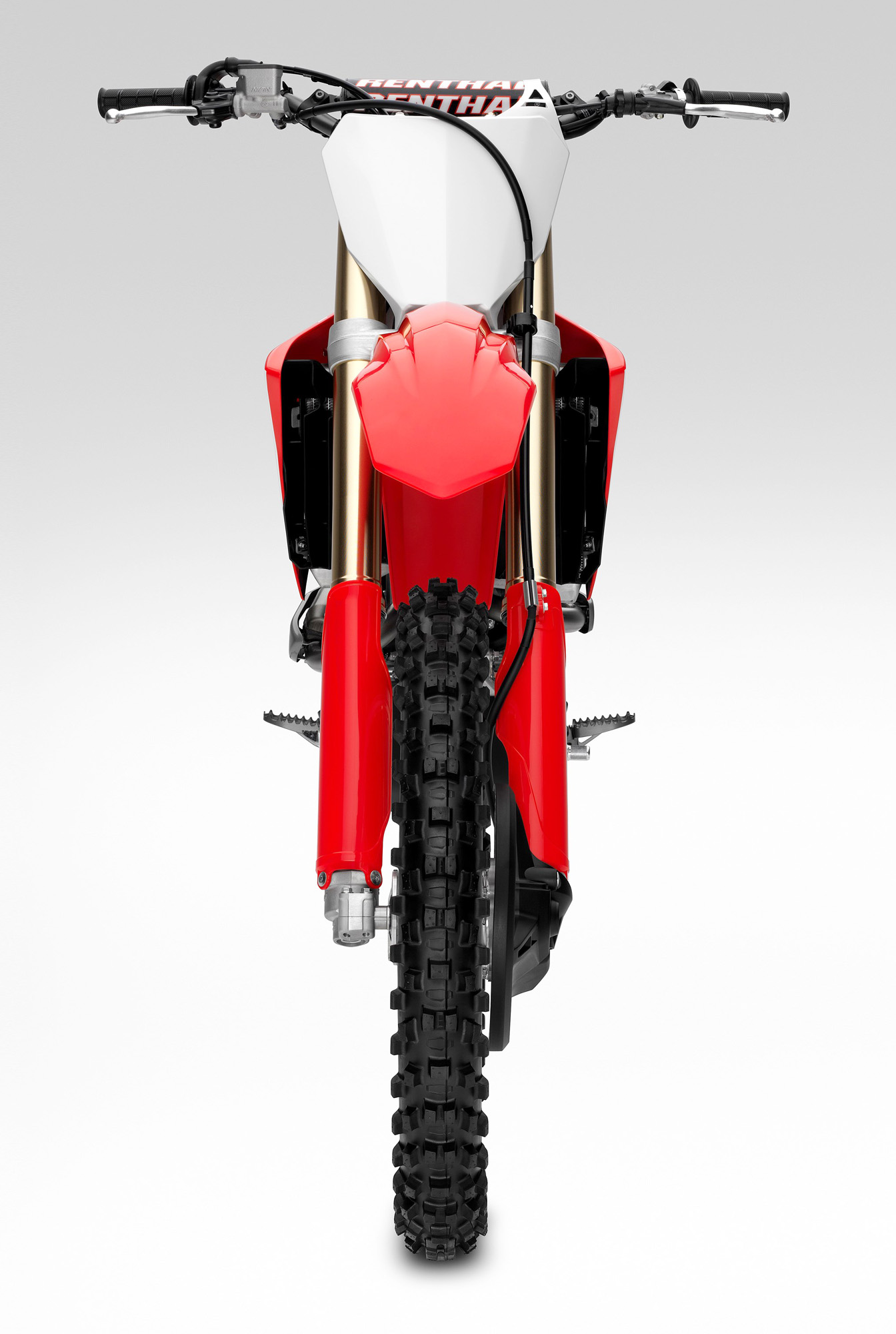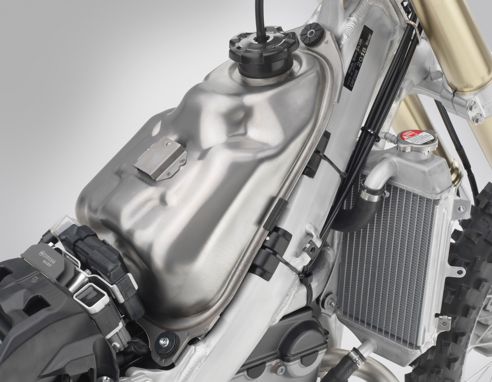 車身方面,采用一副鋁合金闊面車架,叉芯口徑達 49 mm 的昭和(Showa)倒立式前叉,鈦合金的油箱。整個底盤和懸掛系統(tǒng)的設(shè)置,與廠方之前發(fā)布的、MXGP 規(guī)格的 2018' CRF450R 相同。