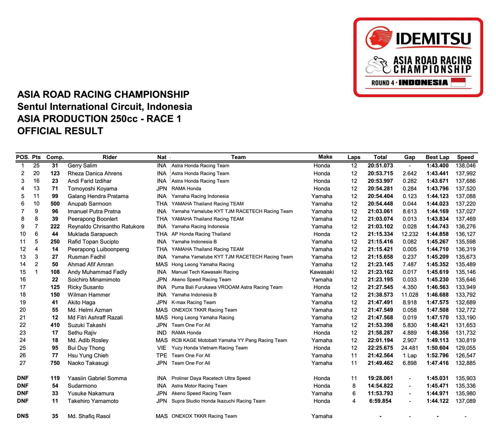 2017' ARRC 印尼站——AP250 級別第一節(jié)賽事成績