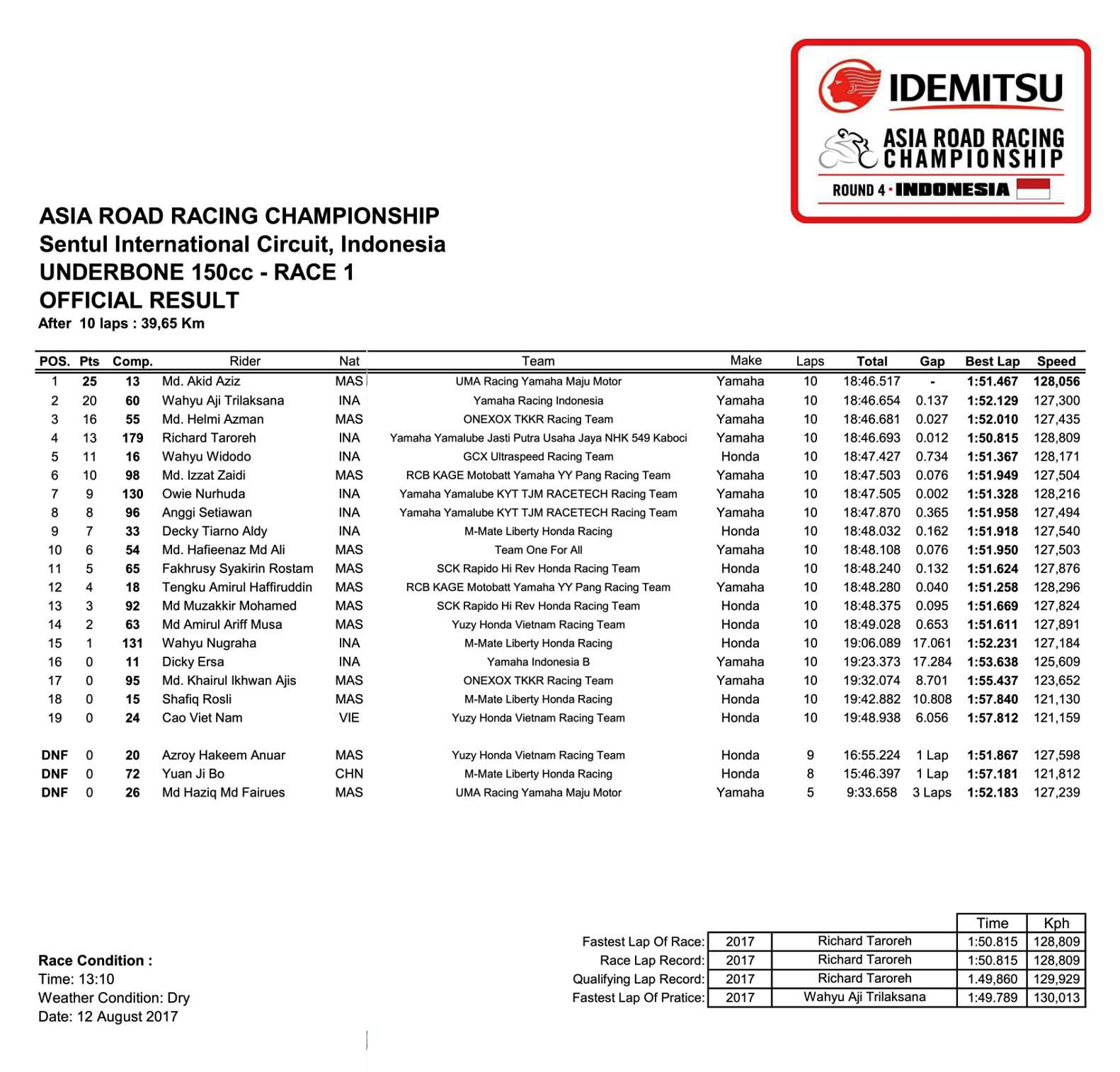 2017 ARRC 印尼站——UB150 級別第一節(jié)賽事成績