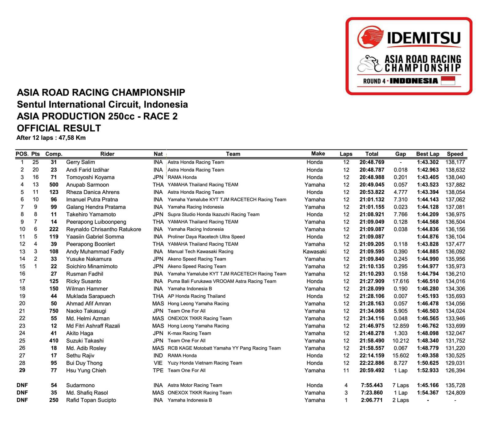 最終,31 號車的印尼車手 G. Salim 奪得第二節(jié)比賽的冠軍,為現(xiàn)場觀眾的歡呼掀起了一個高潮。他的隊友 A. F. Izdihar 獲得了第二,日本車手小山知良拿到了第三。