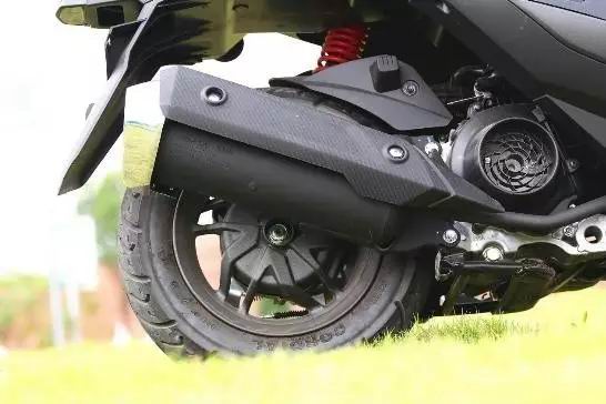 與魔戟125 采用的亮邊防燙板相比,裂行125的碳纖維皮紋板看起來要順眼很多,也能遮擋住不太美觀的排氣外管。