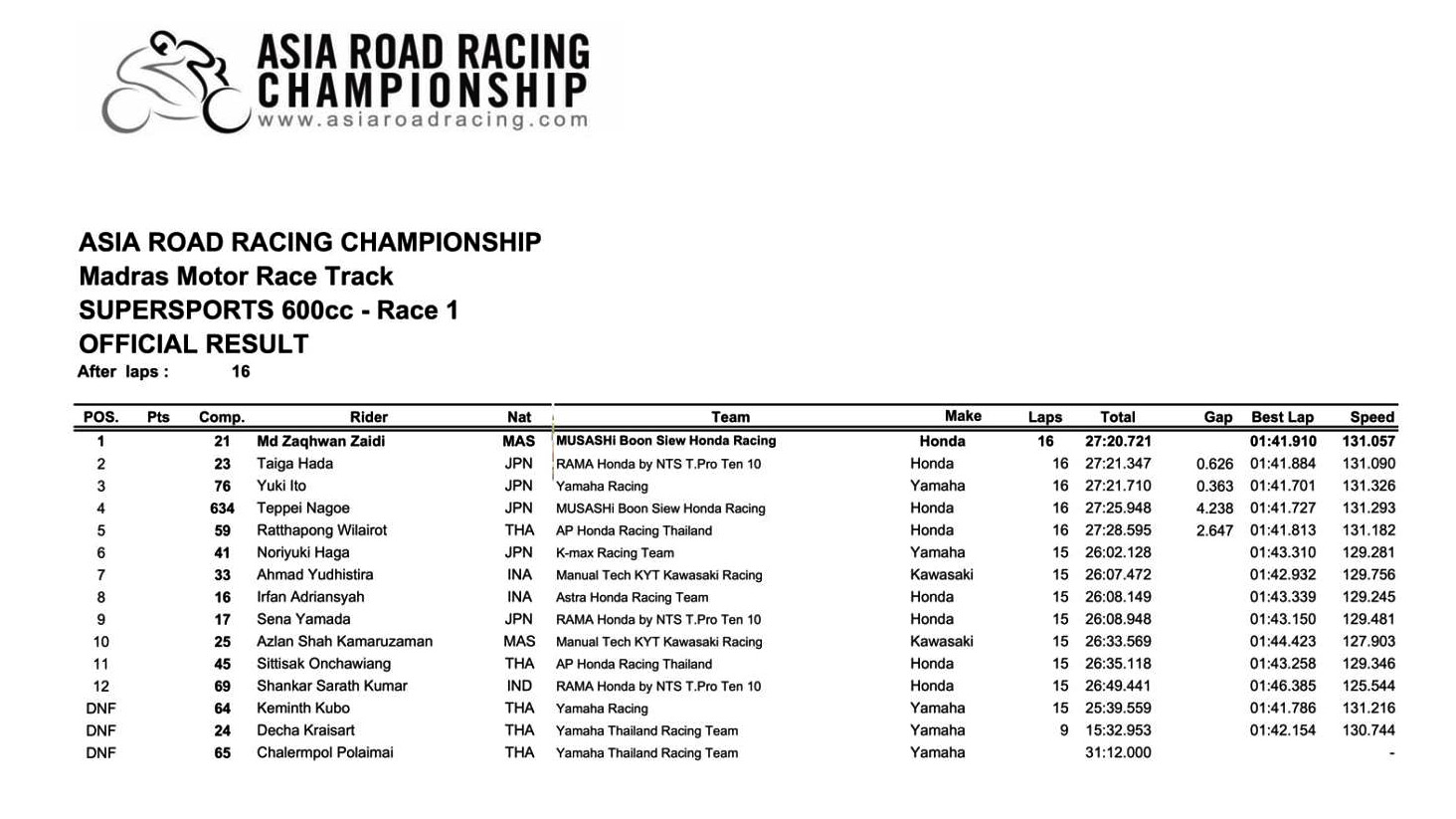 SS600 級別第一節(jié)的比賽,駕駛 21 號賽車(Honda CBR600RR)的馬來西亞車手 Md Zaqhwan Zaidi 以 0.626 秒的優(yōu)勢,力壓多位日本車手奪得了冠軍。而這位馬來西亞車手 Md Zaqhwan Zaidi,是去年亞洲公路錦標(biāo)賽 SS600 級別的年度總冠軍。