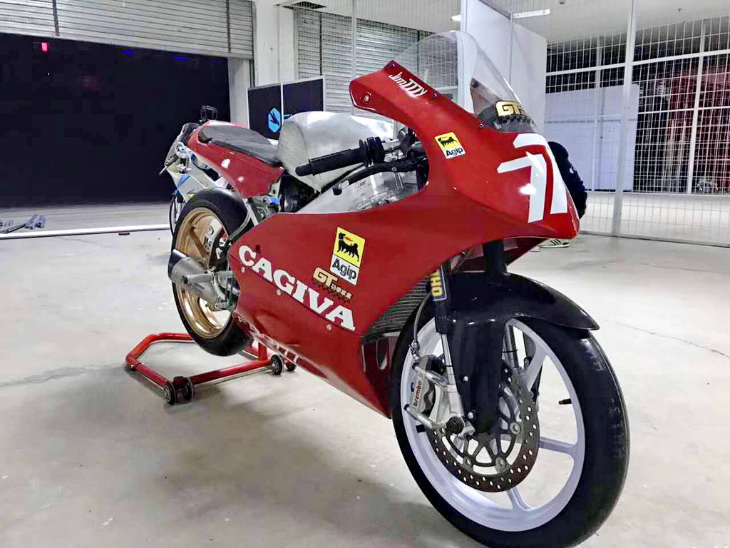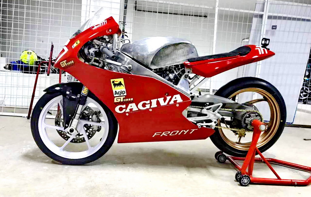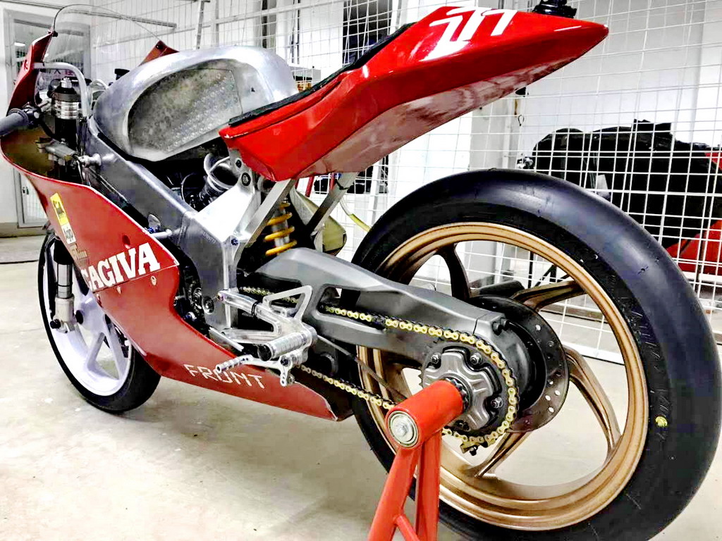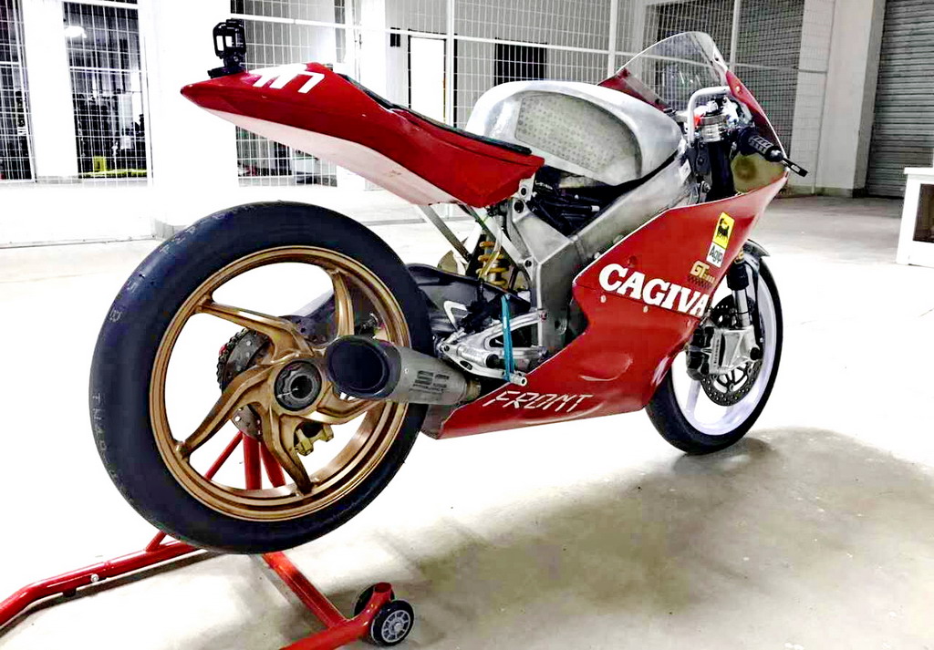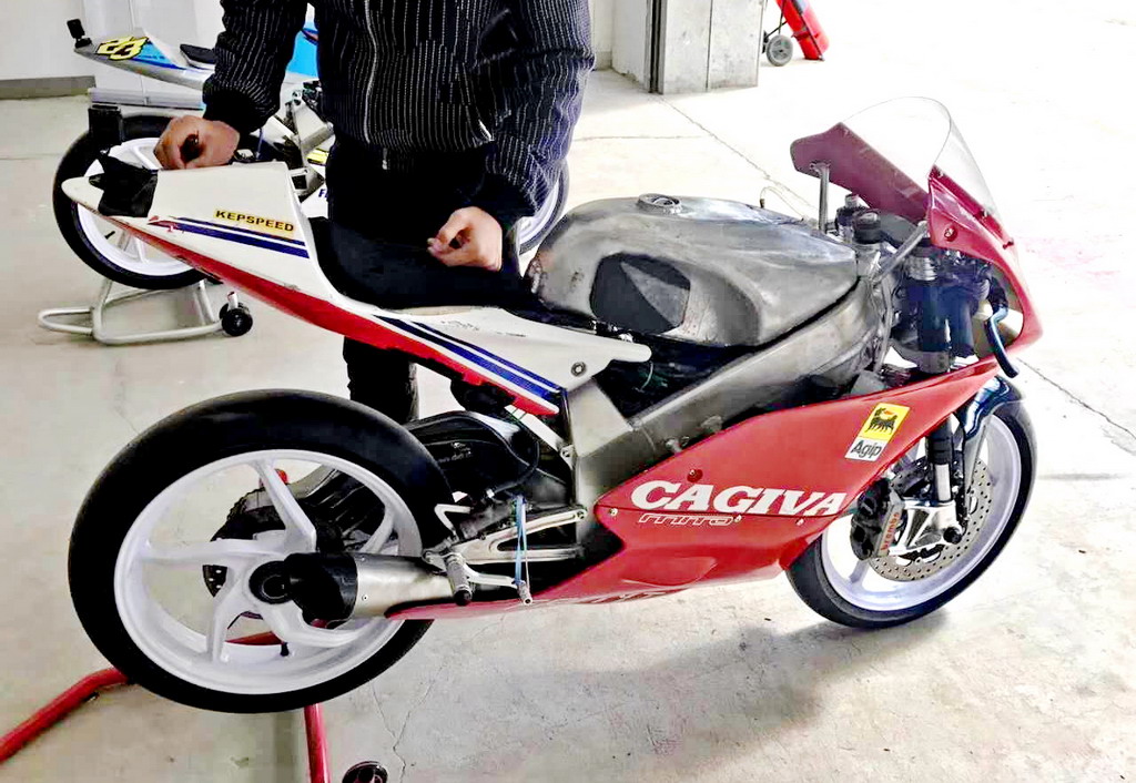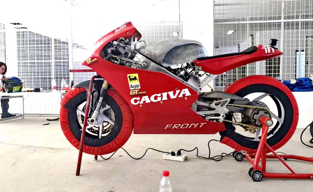CRRC 廠商杯 250 cc 級別,意大利品牌卡吉瓦(Cagiva)的賽車出現(xiàn)在現(xiàn)場。現(xiàn)場看到的這臺賽車搭載一副單汽缸的發(fā)動機,據(jù)悉是由國產(chǎn)的 FK300 修改而來。車身方面,粗壯的鋁合金車架、鋁合金的油箱,單搖臂、Ohlins 的前叉、Brembo 的制動系統(tǒng)、光頭胎,這臺由中國企業(yè)代工的賽車,其表現(xiàn)值得關注。