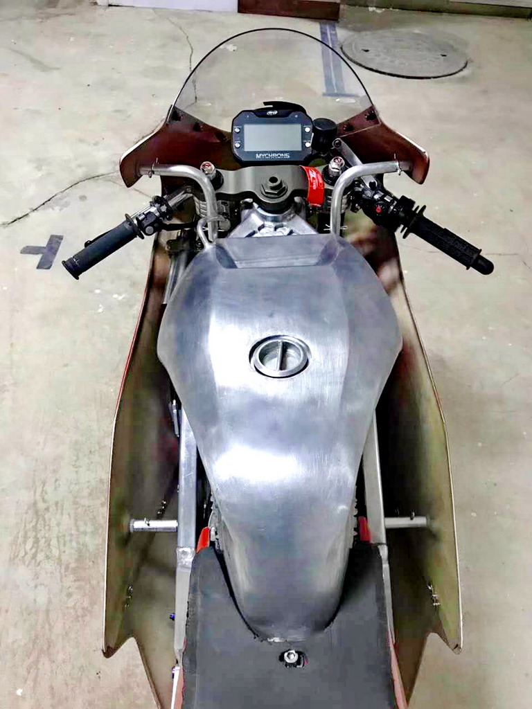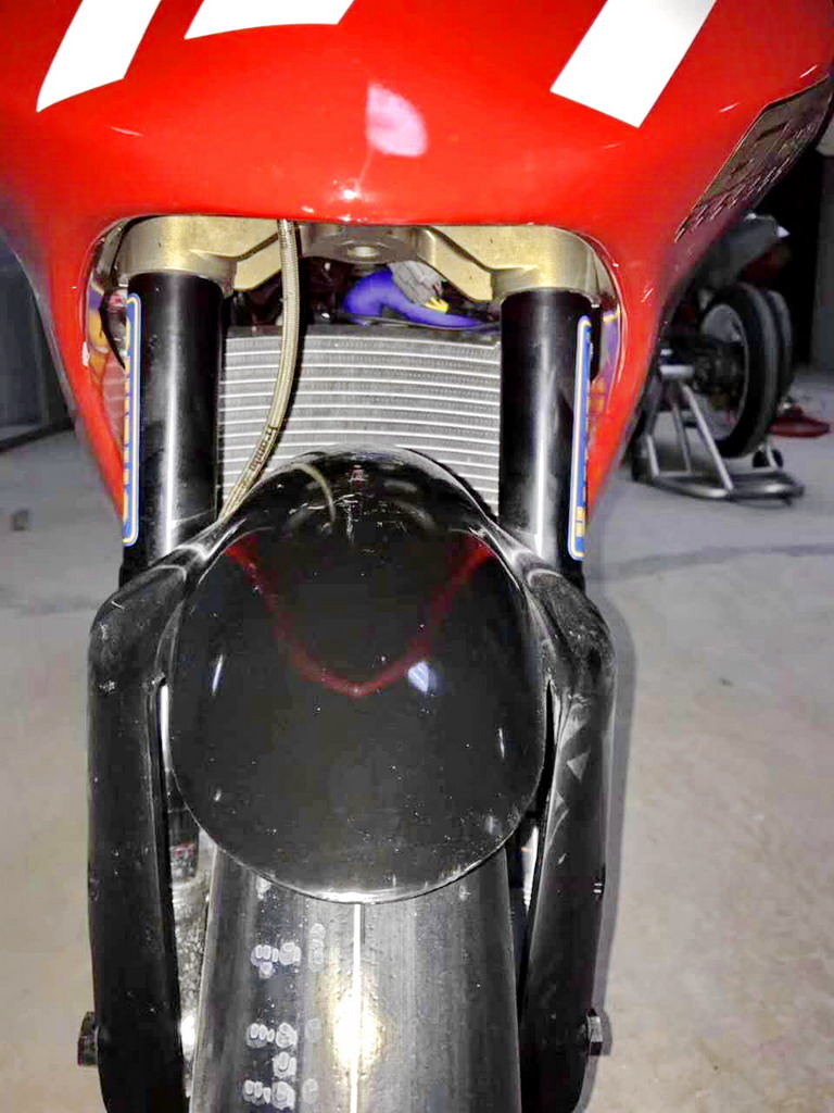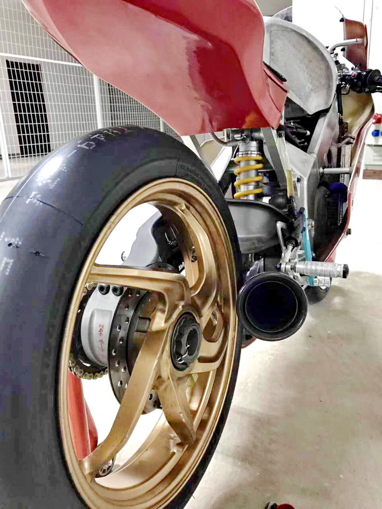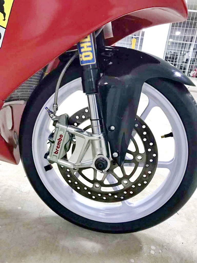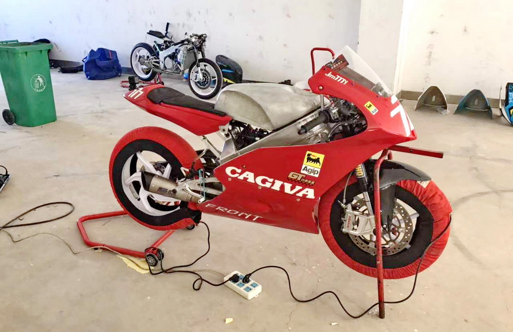 CRRC 廠商杯 250 cc 級別,意大利品牌卡吉瓦(Cagiva)的賽車出現(xiàn)在現(xiàn)場。現(xiàn)場看到的這臺賽車搭載一副單汽缸的發(fā)動機,據(jù)悉是由國產(chǎn)的 FK300 修改而來。車身方面,粗壯的鋁合金車架、鋁合金的油箱,單搖臂、Ohlins 的前叉、Brembo 的制動系統(tǒng)、光頭胎,這臺由中國企業(yè)代工的賽車,其表現(xiàn)值得關注。