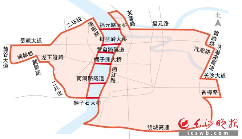 湘江以西區(qū)域?yàn)椋簽t湘路、二環(huán)線、岳麓大道、麓谷大道、楓林路、麓景路、龍王港路、金星南路合圍區(qū)域內(nèi)的道路(含邊界道路)。