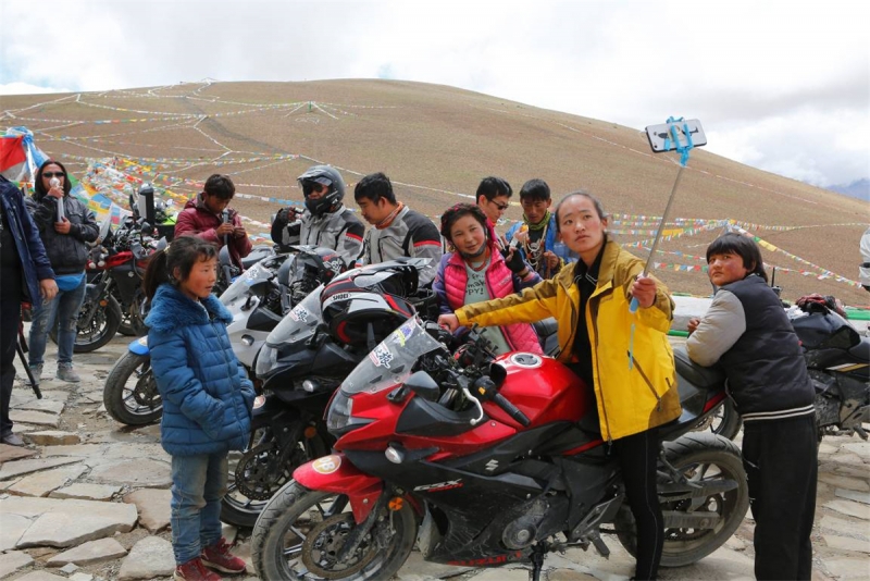 不得不說DL250自由之旅車隊(duì)到達(dá)每個(gè)地方都備受歡迎,哪怕是在人煙稀薄的珠峰路上。到達(dá)加吾拉山口(5198海拔)的時(shí)候藏民們一擁而上,騎手們還真有點(diǎn)受寵若驚了?。ㄈ跞跽f句,車子比騎手受歡迎,自拍神器無所不在啊!哈哈哈)