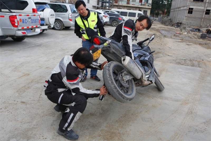 這種加鏈條油的方式絕對(duì)是一個(gè)經(jīng)典,對(duì)于沒有大腳架的GSX來說,這就是正確姿勢(shì)。負(fù)責(zé)翹起GSX250R的騎手太子說:“只要找到支點(diǎn),其實(shí)很輕松的!”