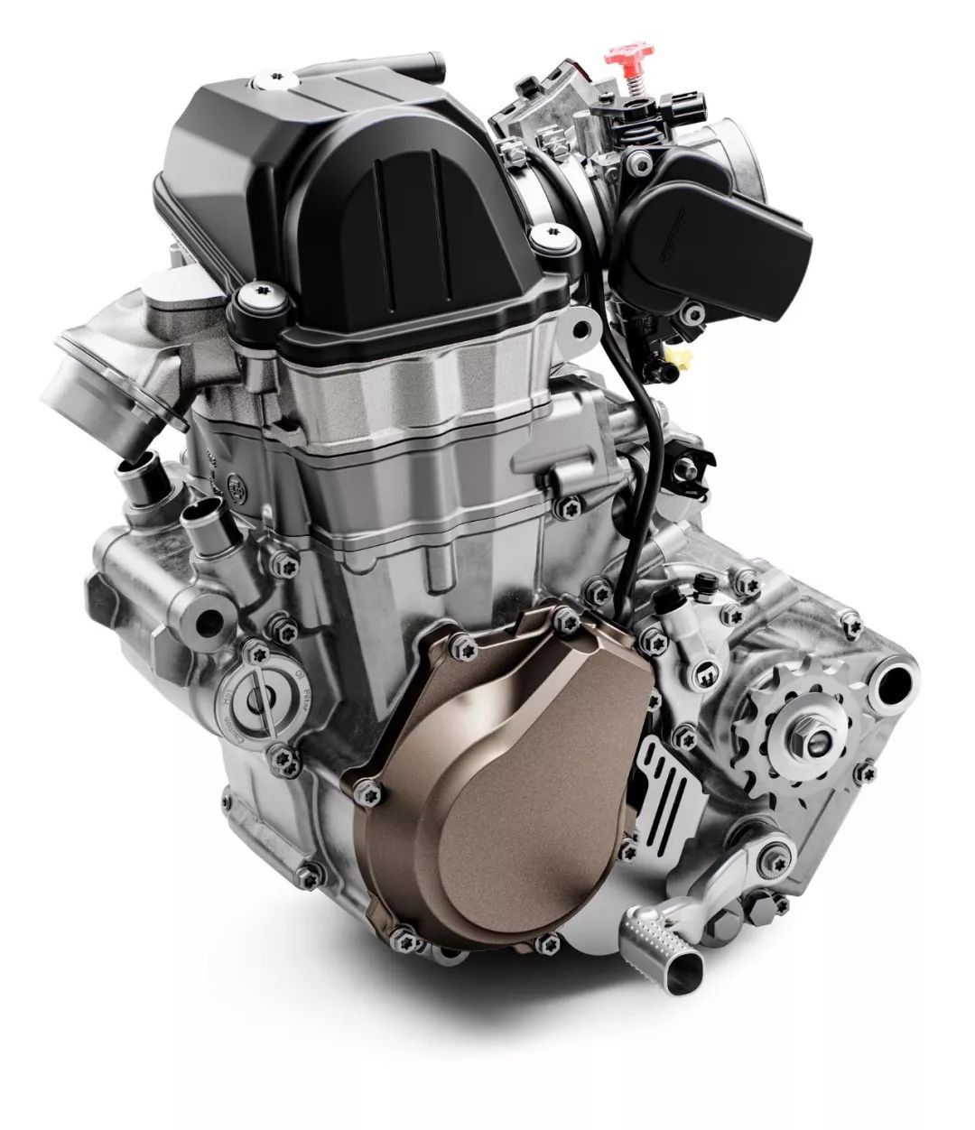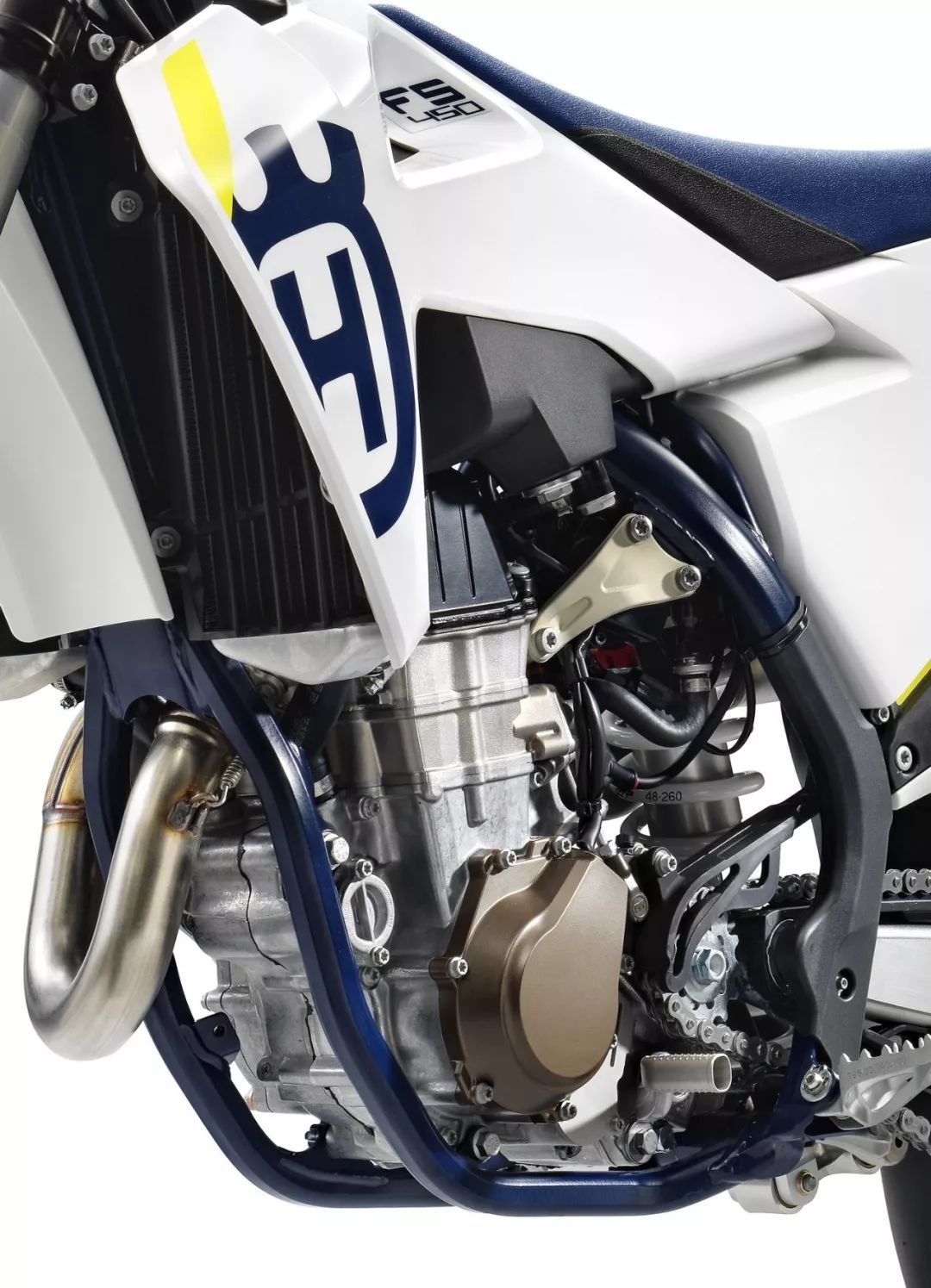 新的 2019' FS450 與場地越野(Motocross)賽車 2019' FC450 共享相同的平臺,動力來源是一副水冷四沖程單汽缸、SOHC 四汽閥的發(fā)動機,高達(dá)的 1.5:1 的缸徑、行程比(95 mm x 63.4 mm),排汽量 449.9 cc,節(jié)汽閥口徑為 44 mm 的 Keihin 電噴系統(tǒng),五檔的變速齒輪箱、配備了瑞士 Suter 的滑動式離合器,最大動力輸出 63 匹。對比 2018 款,新的 2019 款采用了新設(shè)計的輕量化汽缸蓋(重量降低了 500 克),更新了發(fā)動機電子管理系統(tǒng)內(nèi)、牽引力控制以及起步控制系統(tǒng)的數(shù)據(jù)。